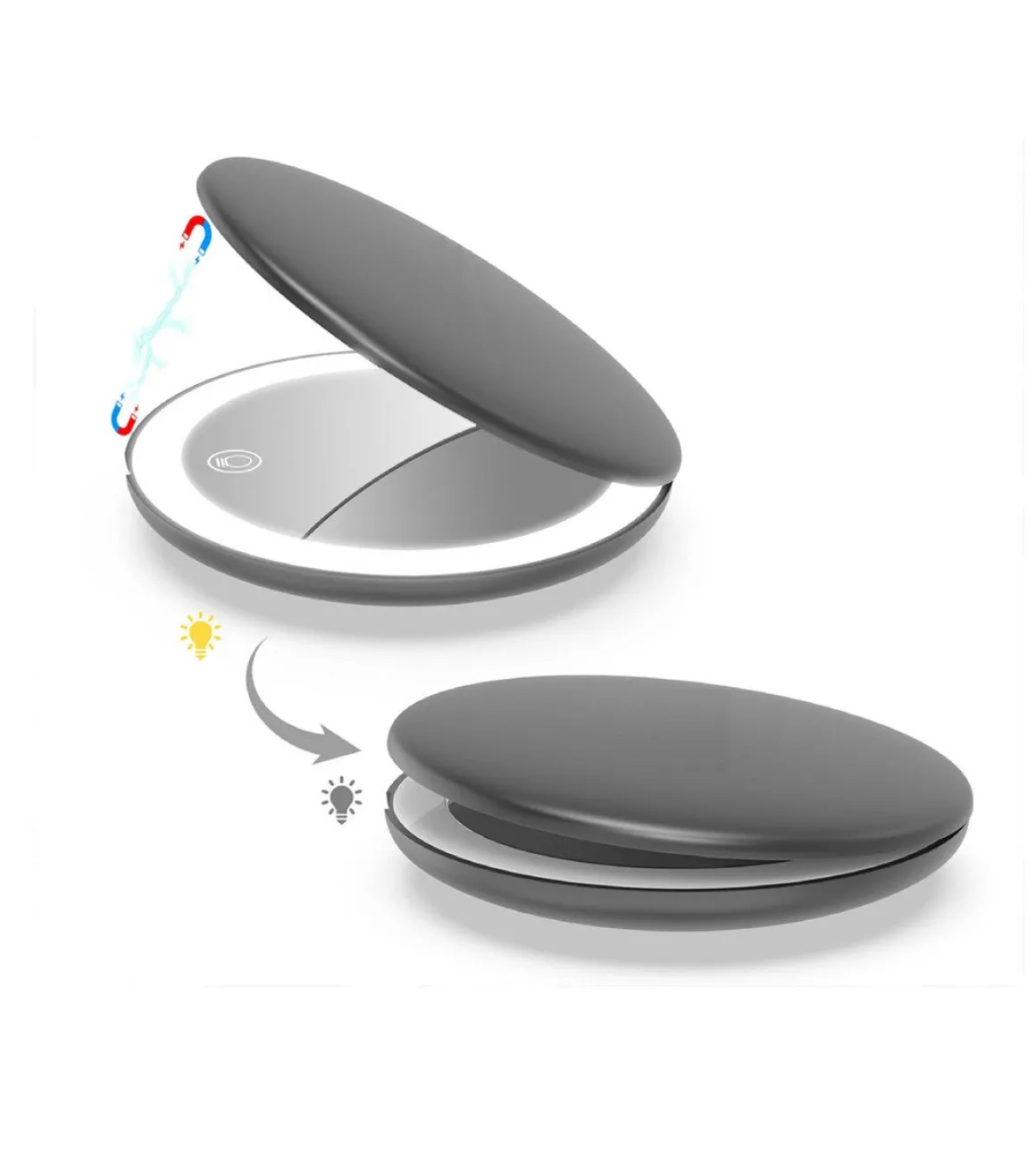 Delikat og lite håndholdt sminkespeil med oppladbart lys. Touch-bryter for av/på, valg av fargetemperatur på lyset og trinnløs dimming. Lyset slukkes automatisk når sminkespeilet lukkes. Inkl. USB C ledning.