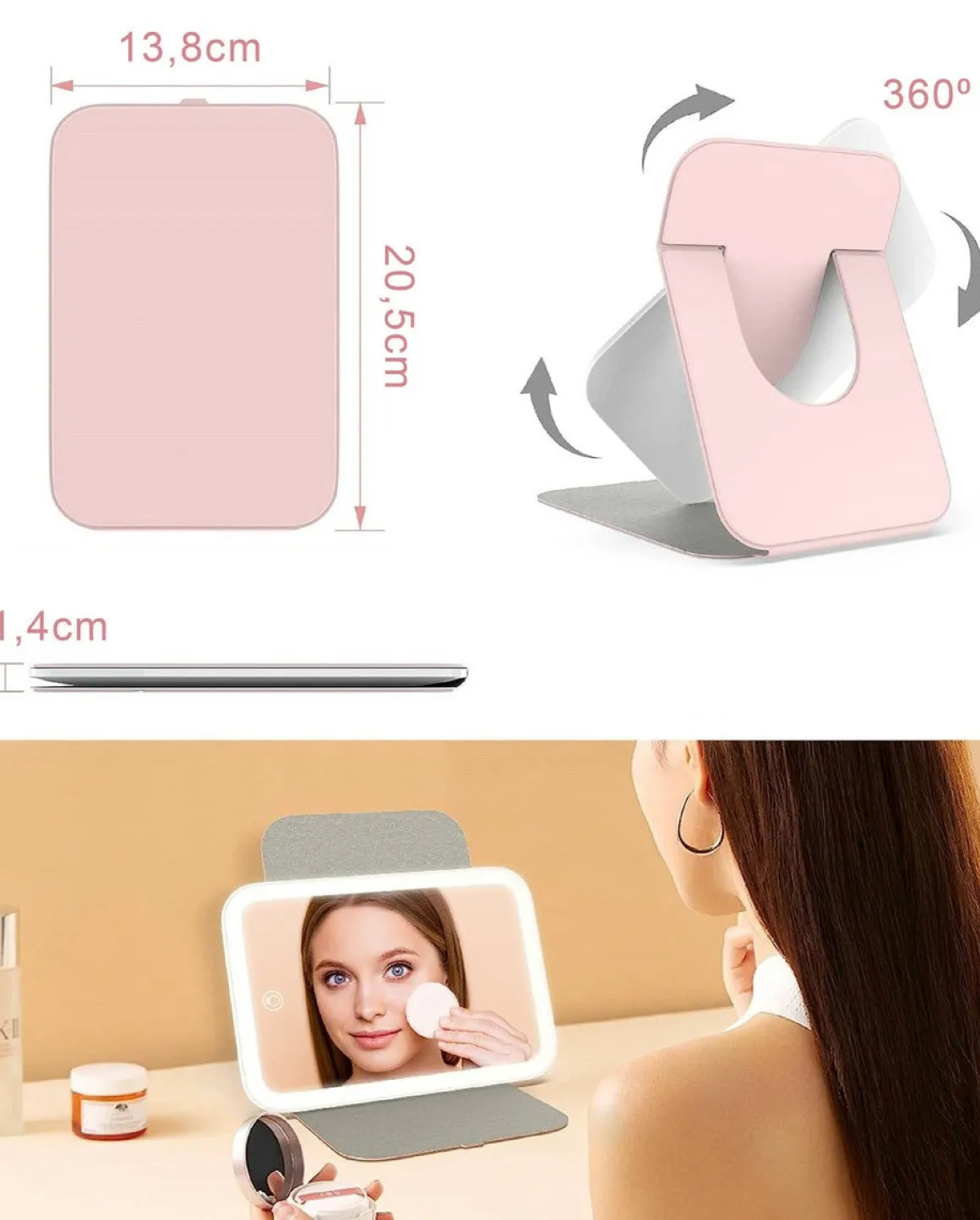 Stilrent og stort sminkespeil med oppladbart lys. Touch-bryter for av/på, valg av fargetemperatur på lyset og trinnløs dimming. Lyset slukker automatisk når sminkespeilet lukkes. Speilet er roterbart på omslaget og kan settes i ulike posisjoner. Inkl. USB C ledning.