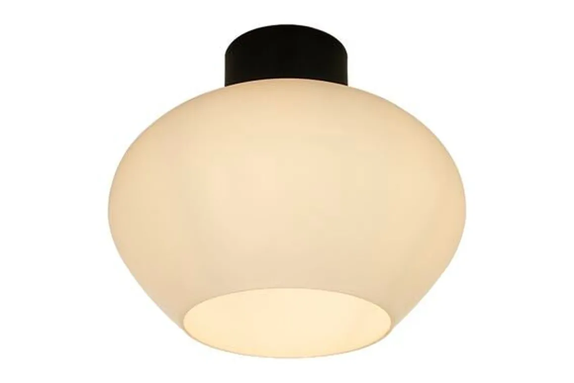 Bell plafond i svart med opalhvit glass på fastmontert base. Lampens hovedmateriale er metall og glass. Max wattstyrke er 30W. Lyspærer følger ikke med. Plafonden monteres i taket på krok og kobles til strøm med koblingsklemme.