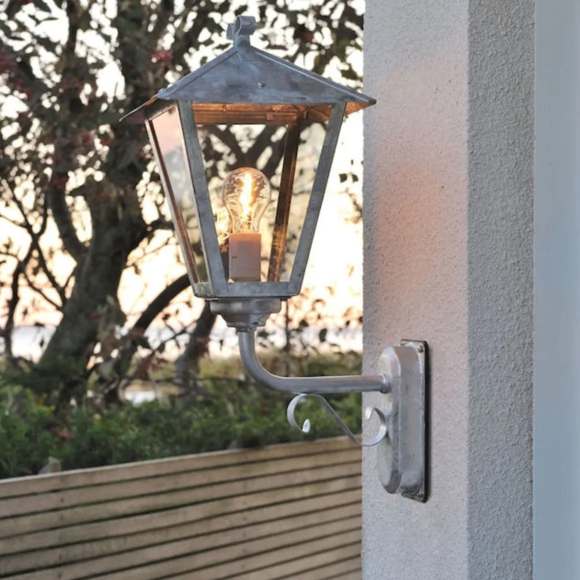 Benu er en vegglampe som er vendt opp. Utelampen er metallisk, stilren og er galvanisert. Beregnet for utendørs bruk.