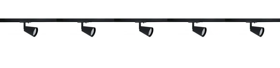 Komplett 2 meter spotskinne med 5 spotter. Lyspærer kjøpes separat med GU10 sokkel.