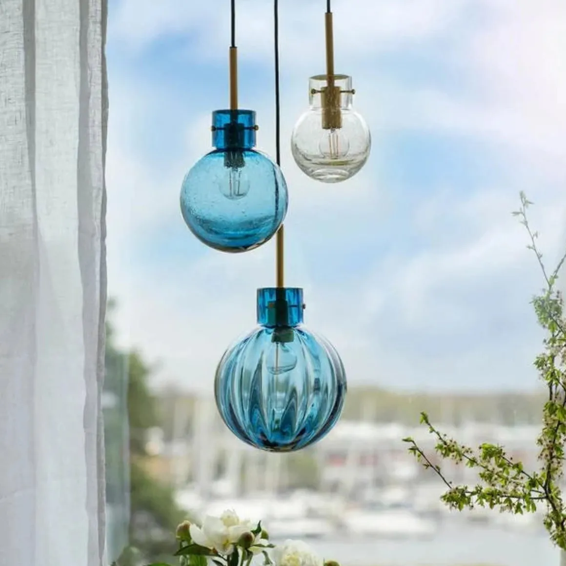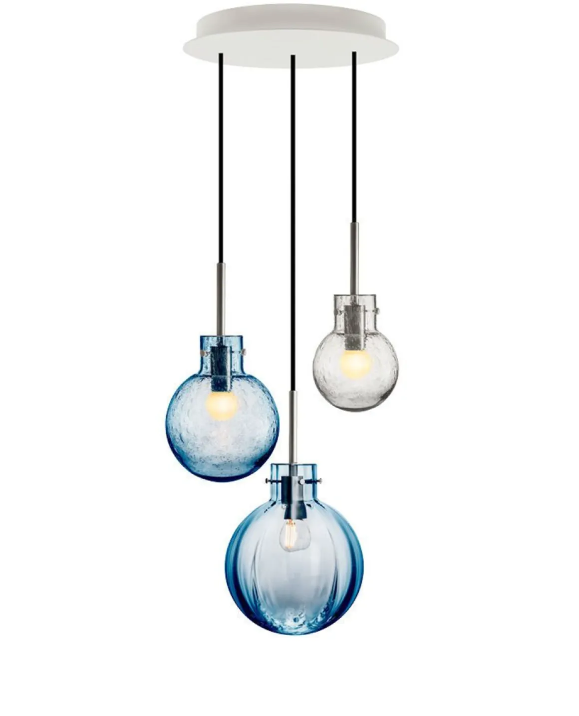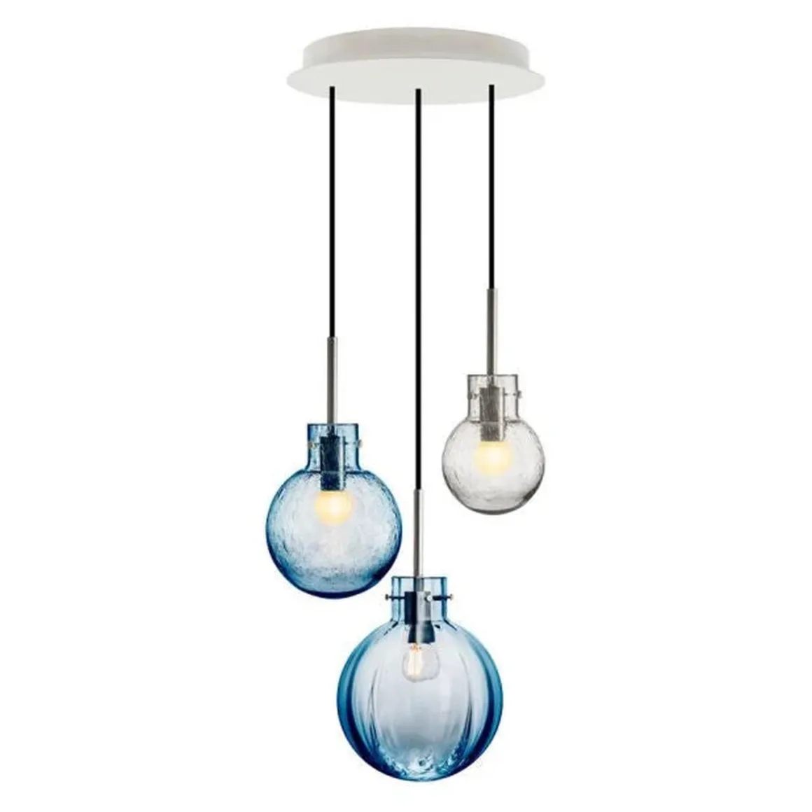 I denne kombinasjonen er det brukt følgende krystallkuler: Optikk stålblå 200 mm, Soda stålblå 160 mm og Soda klar 120 mm. Messingoppheng til 3 krystallkuler med sort tekstiltrukket kabel på 3 meter. Rund takbaldakin 34cm.