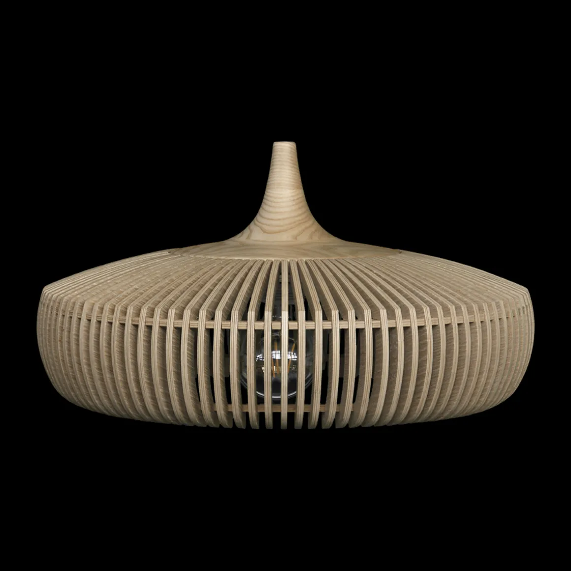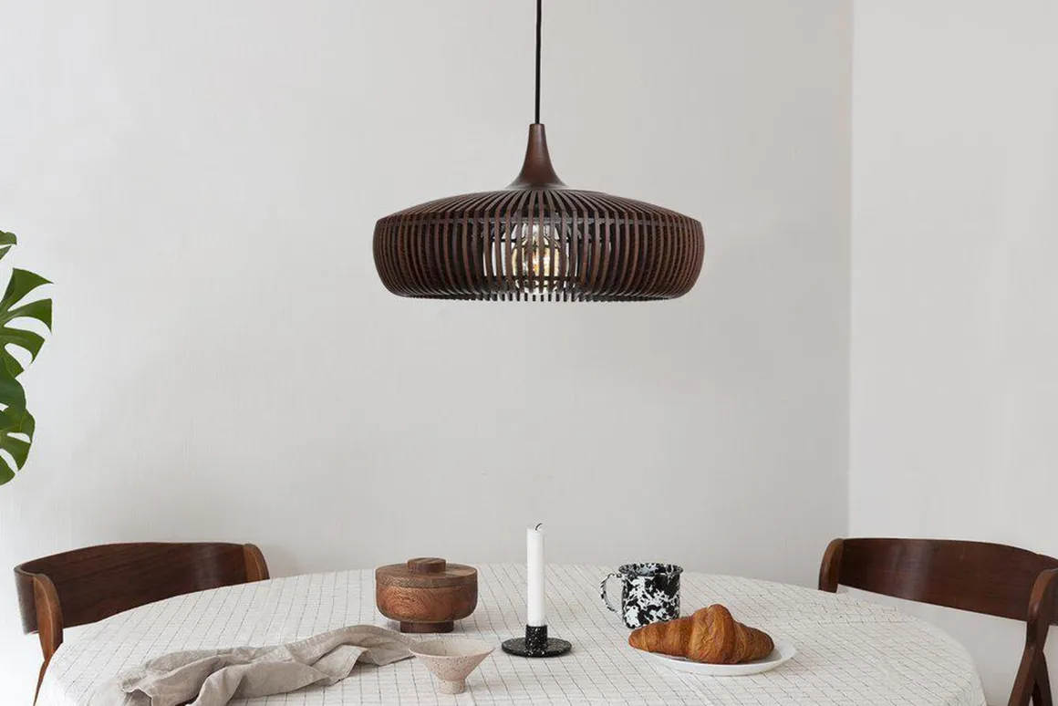 Clava Dine Wood-lampeskjermen er designet av en håndverksteknikk som krever en unik presisjon og nøyaktighet på grunn av den lille avstanden mellom hver lamell. Tre lamellene er laget av laserskåret ask og finér av eik med solid eik. Lampeskjermen skiller seg ut som et skulpturert designverk som skaper en lekende lysglimt på veggene i det omkringliggende rommet. Lampehettenes troskap skaper et vakkert mønster som kan beundres fra alle vinkler, både på innsiden og på utsiden av lampeskjermen.