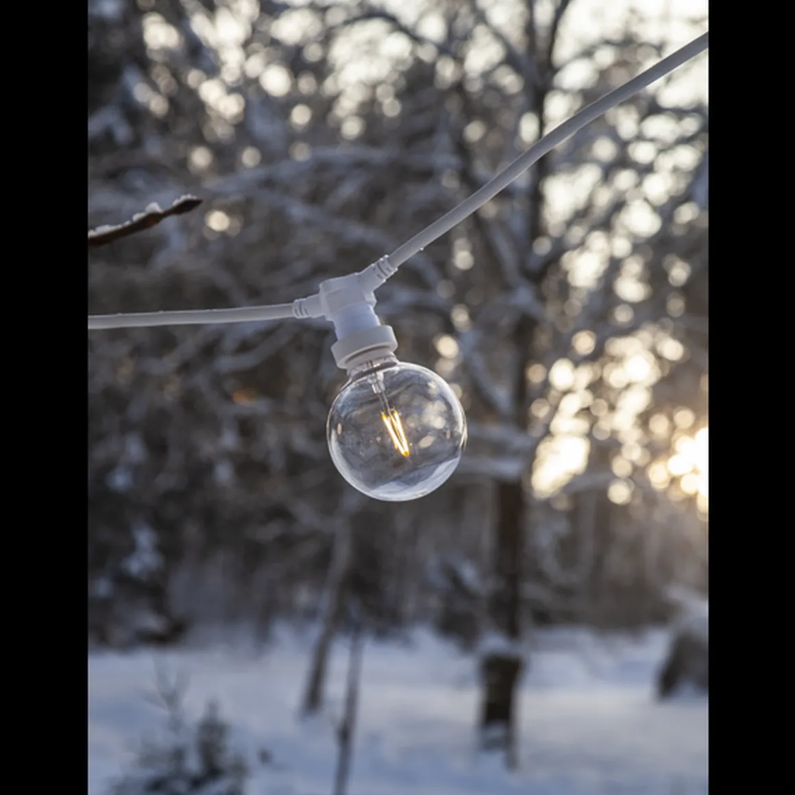 LED lyspære av plast som tåler å henge utendørs. Passer utmerket til lysslynger.