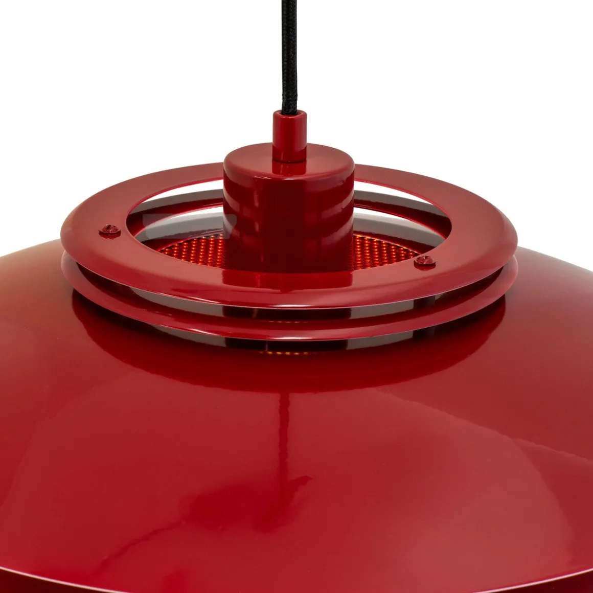 Ejka er en vakker pendel i mørkerødt metall. Den er åpen i toppen og sprer derfor lyset godt.