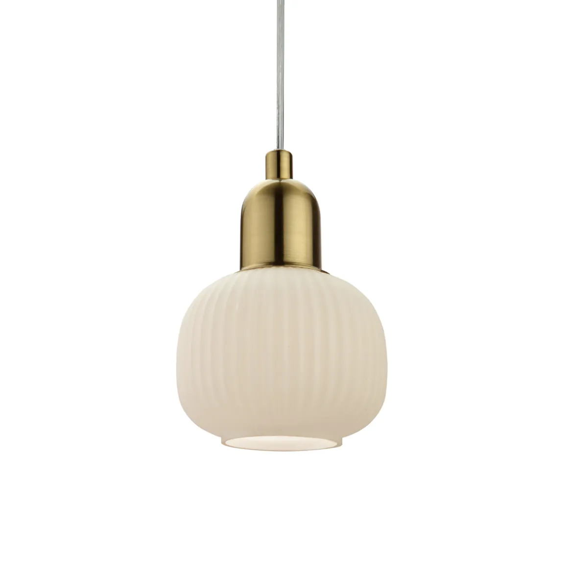 Den populære vinduspendelen Elin har et stilig design med kopp i matt messingfarget metall og et opalhvitt glass med dekorative riller. La Elin lyse opp plantene i vinduskarmen for en koselig atmosfære i rommet. Eller hvorfor ikke ved siden av sengen som nattbordslampe eller over sofakroken? Heng opp en, to eller flere avhengig av uttrykket du vil lage.