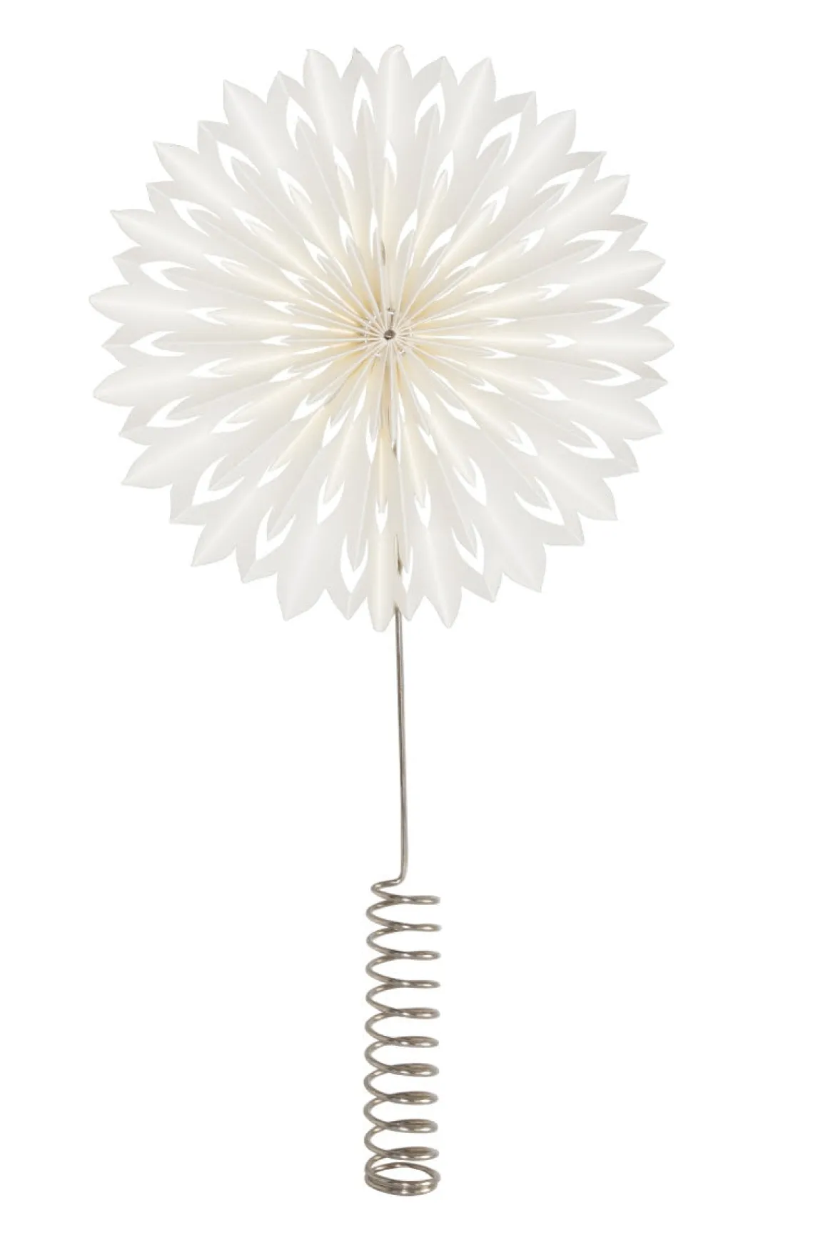 Elvira er en pen toppstjerne i hvitt papir, som utstråler nostalgi med sitt sirkulære design og mønster. Julestjernen fra Watt & Veke har et minimalistisk design i papir med en vinterlig stil perfekt for å pynte toppen på juletreet. Elvira toppstjerne er 20 cm i diameter og leveres i en elegant eske for sikker oppbevaring og selvfølgelig til å passe som julegave.
