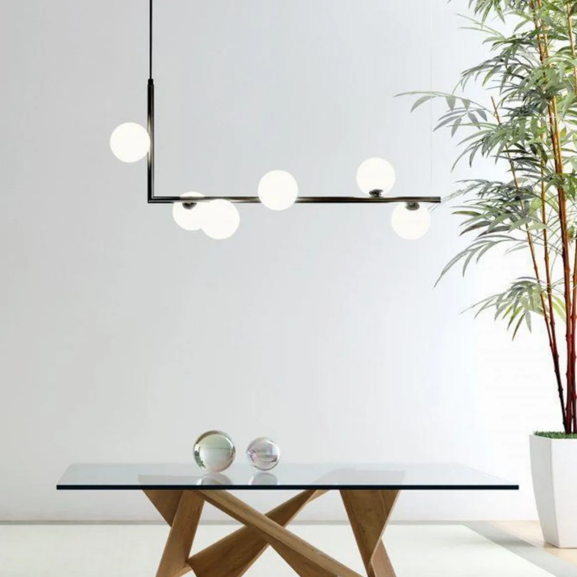 Emrik G9 er en stilig pendel i avlangt design med sort utførelse og med hvite glasskupler. Glasskuplene lyser perfekt og gir et vakkert design. Dimbar avhengig av valgt lyskilde (G9).