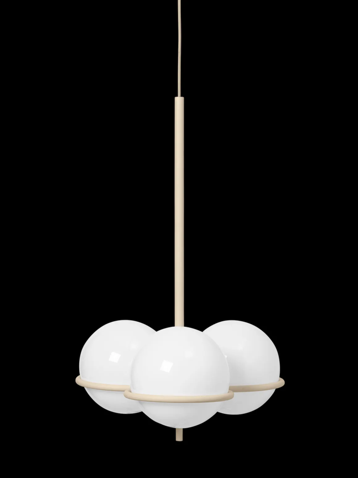 Era taklampe fra Ferm Living har et art deco-inspirert design. Lampen har 3 stk opalhvite glasskuler i glass som sørger for et behagelig og vakkert lys til rommet. Lampen har en stilren base i jern med pudderlakkert finish i fargen cashmere. Lampen har lang ledning for fleksibel opphengning med flere plasseringsmuligheter. Dette er en lampe som er flott i gangen, trappeoppgangen, på soverommet eller over spisebordet.