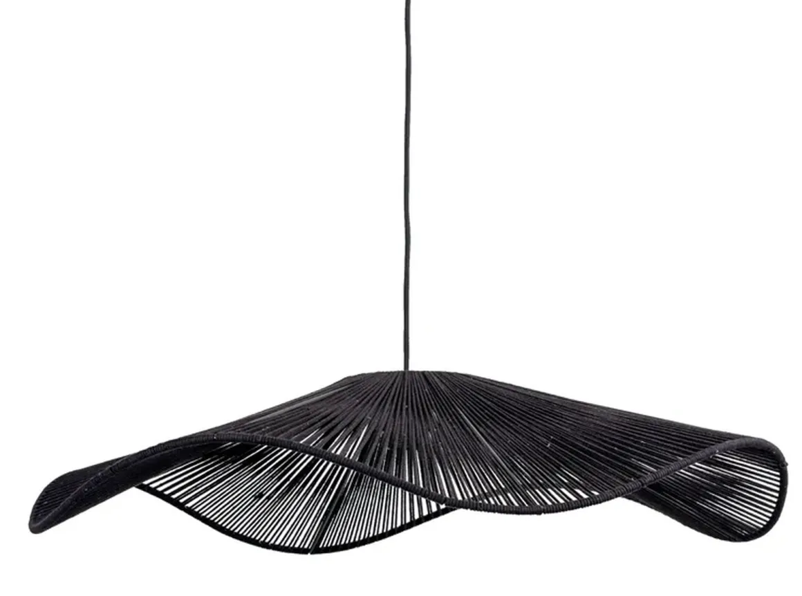 Taklampe på 78 cm med base i jern trukket med bomull. Nydelig flytende fasong.