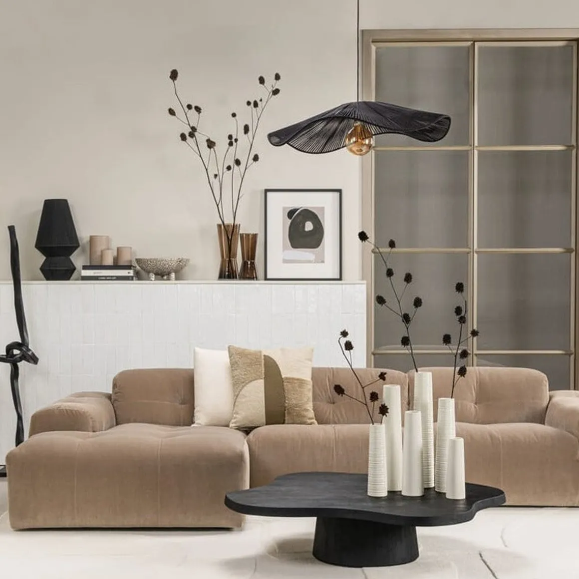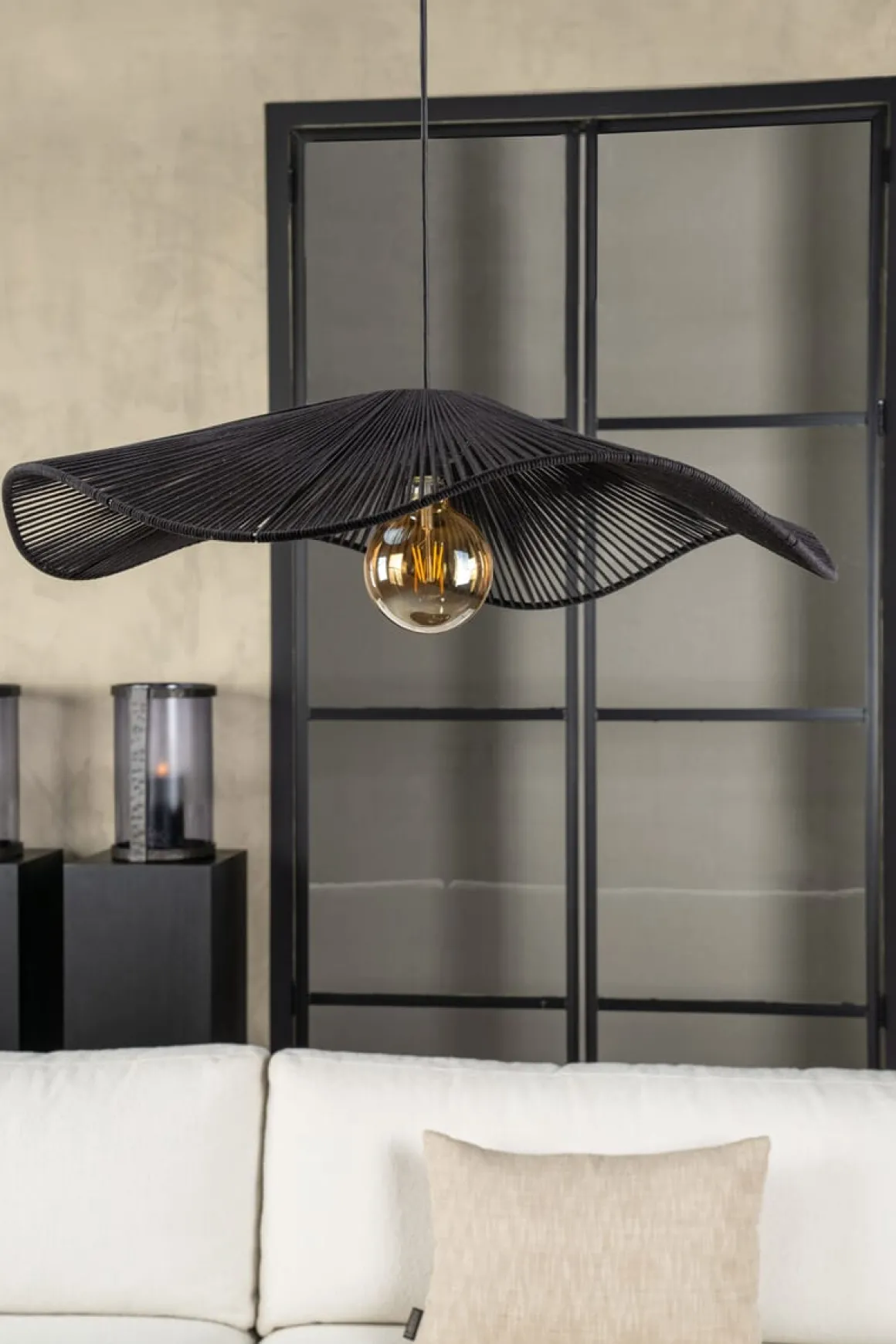 Taklampe på 78 cm med base i jern trukket med bomull. Nydelig flytende fasong.