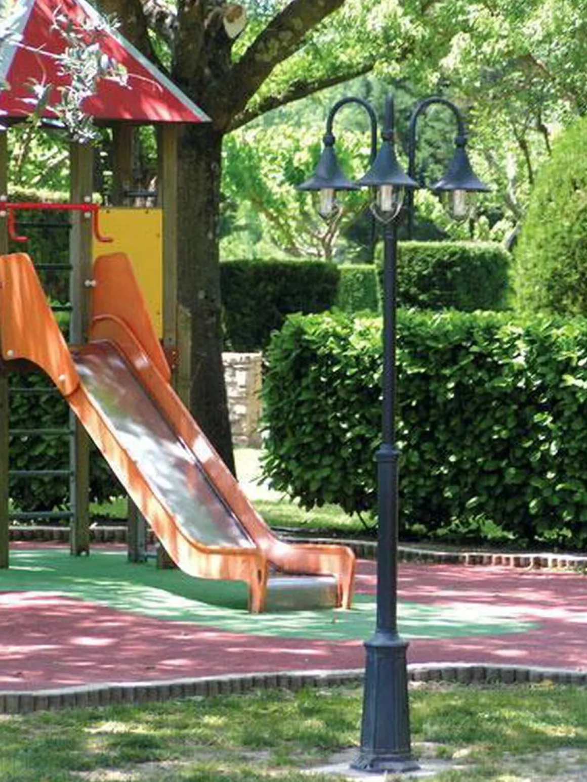 Lampen er en del av en serie som inneholder vegglampe, lampe i kjetting, blomsterstolpe og teleskopstolper med 1 til 3 lyktehoder.