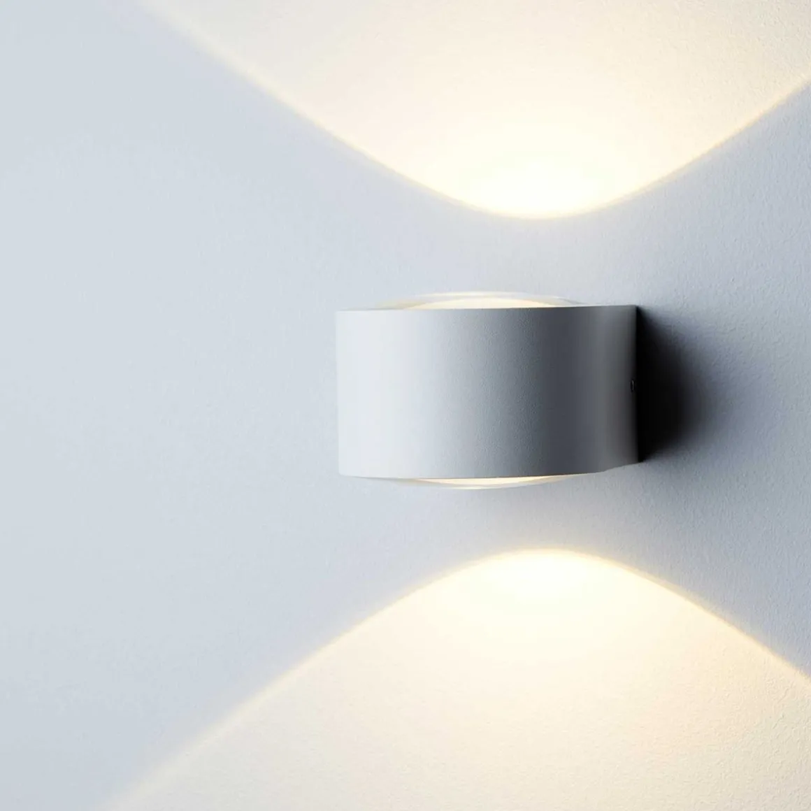 Frey IP65 vegglampe i hvit har et trendy design med sylinderformet skjerm og krystallglass linser. Det kan avgi fantastisk lys på kjøkkenet, stuen, badet og på fasaden utendørs. Lysets 100 ° strålevinkel oppover og nedover som en lyskjegle, gir et fint lysspill på veggen. Lampen har en innebygd LED, laget av støpt aluminium, og er tilgjengelig i svart eller hvit med en IP65-kapslingsgrad