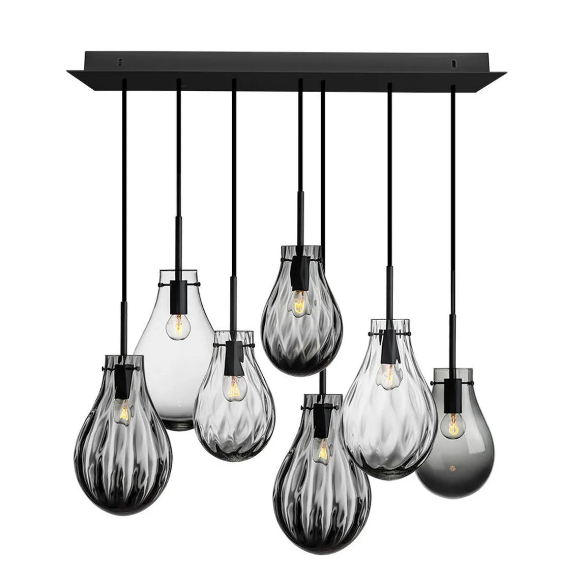 Pakken inneholder: 2 stk Dråpe stor i Røkgrå Dobbeltoptikk, 1 stk Dråpe stor lys Røkgrå Dobbeltopptikk, 1 stk Dråpe liten lys Røkgrå Dobbeltoptikk, 1 stk Dråpe liten Røkgrå Dobbeltoptikk, 1 stk Dråpe liten Røkgrå Dugg, 1 stk Dugg liten Lys RøkgråSort. Oppheng til 5 dråpelamper med sort tekstiltrukket kabel på 3 meter, Sort avlang takbaldakin på 100 cm
