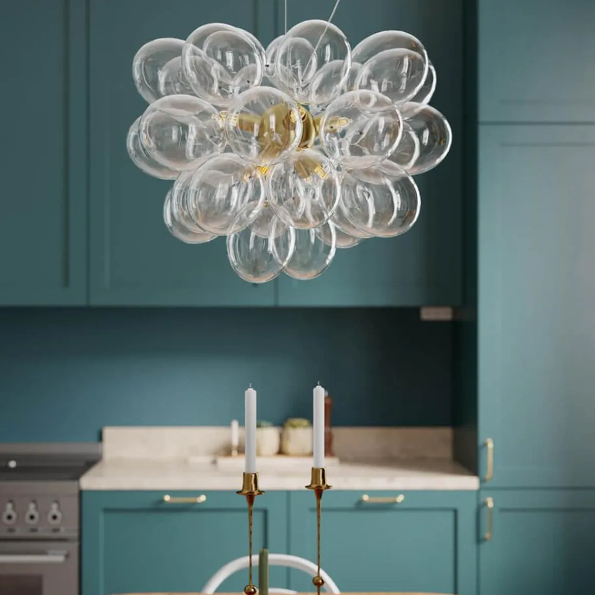 Unn deg høyden av luksus og stil med Gross taklampe Ø50cm, en svevende sky av 37 lette, munnblåste glassklokker som ligner atomer og avgir et herlig skinn. Gross er By Rydéns egen serie og et blikkfang i nettbutikken vår. Lampen finnes flere farger; Matt hvitt, Ravgult, Røykgrått, Flerfarget och Nacreous.