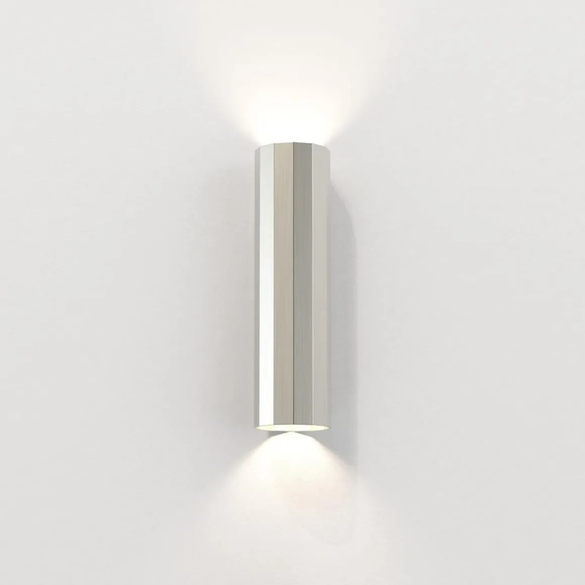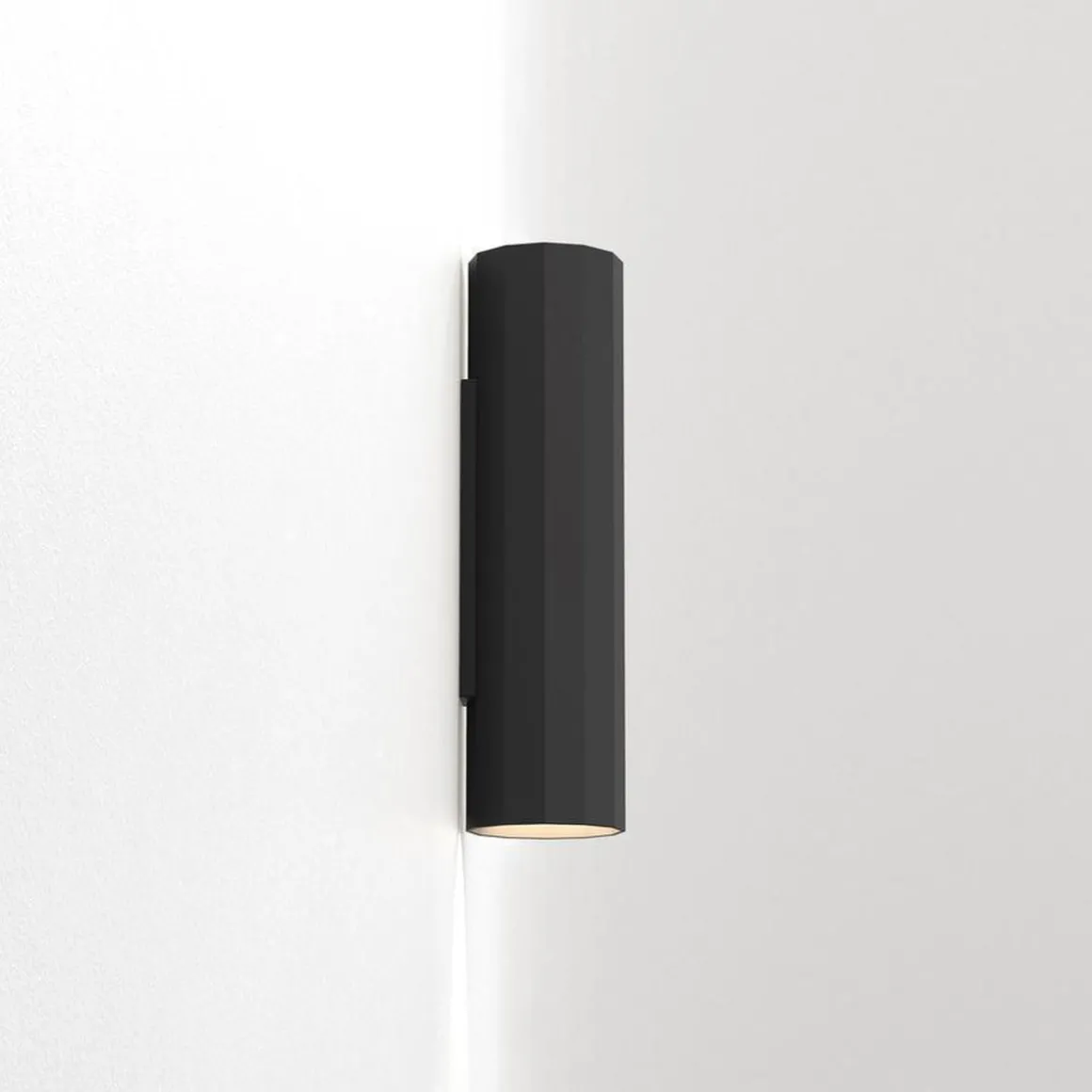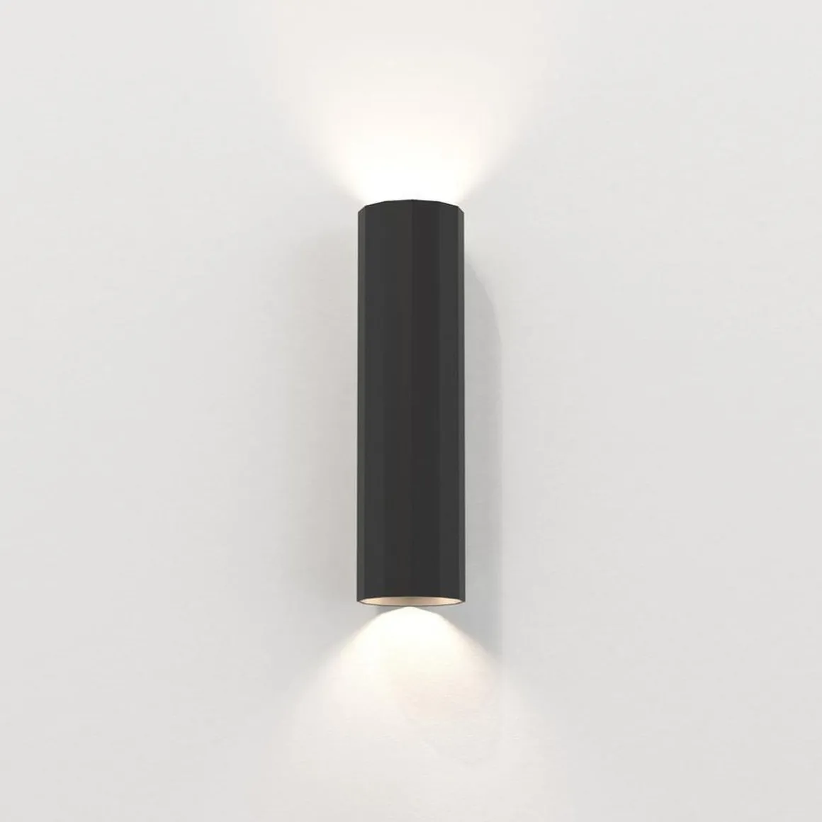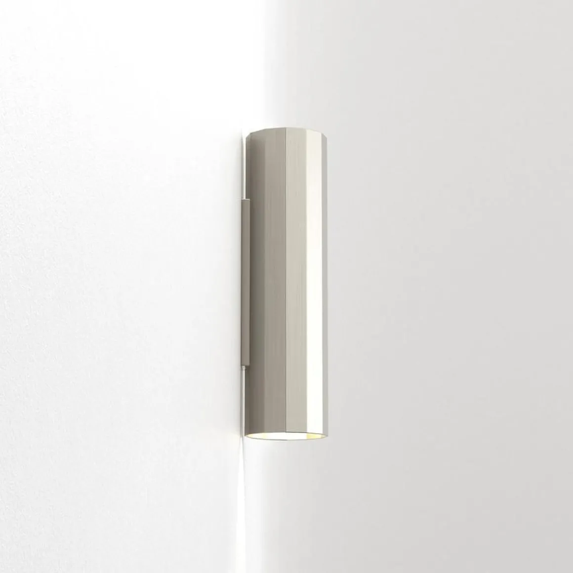 Vegglampen Hashira 300 er en moderne fasettert form inspirert av nyklassisk arkitektur. Den vasker definerte lysboller oppover og nedover, og kaster komplekse skygger som gjenspeiler formen. Den kommer i matt svart, matt nikkel eller matt gull og har ingen synlige fester for et sømløst utseende.
