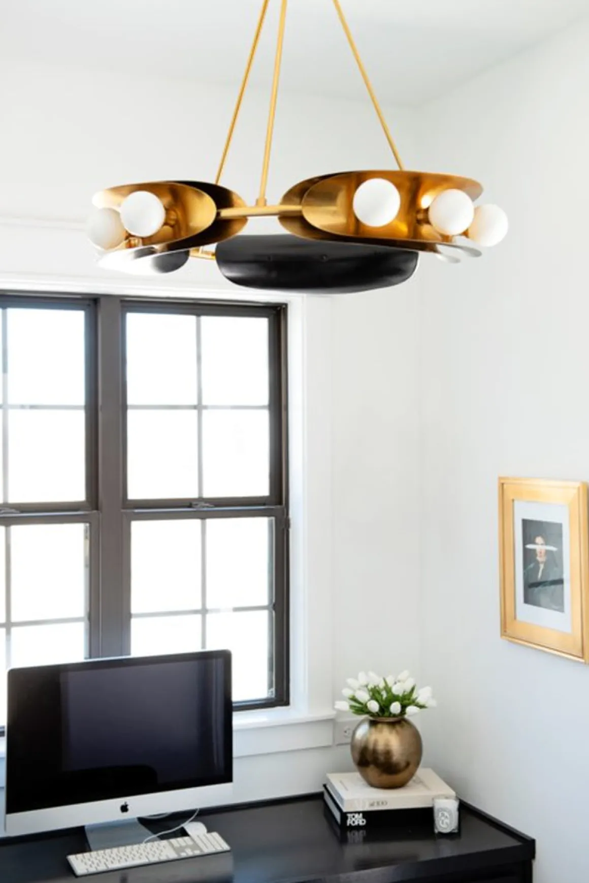 Hopper er en elegant, sofistikert lysekrone med industrielt preg som løfter ethvert rom. Heng den over et bord eller midt i rommet om høyden tillater det. Lampens høyde kan reguleres fra min 69cm – max 250cm fra taket. Lampen har 9 kupler i opalhvitt glass og sørger for godt lys til rommet.