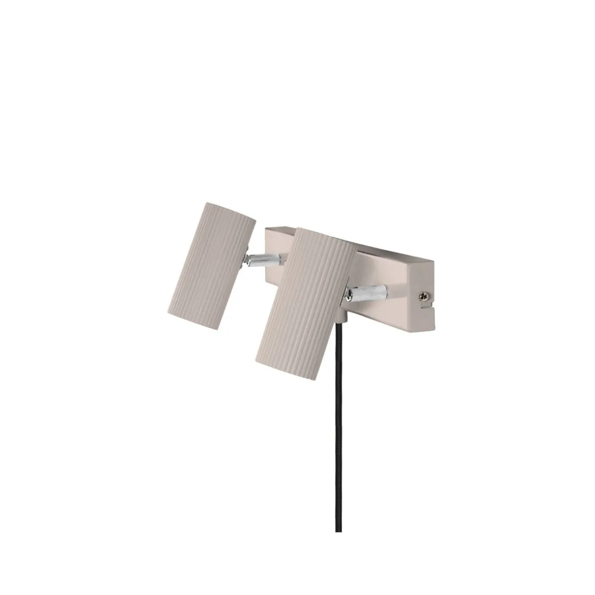 Hubble er en moderne vegglampe med rørformede og ribbede metallskjermer. Skjermen kan vinkles vertikalt og sideveis. Lampen er laget av matt beige lakkert metall med detaljer i kromfarget metall.