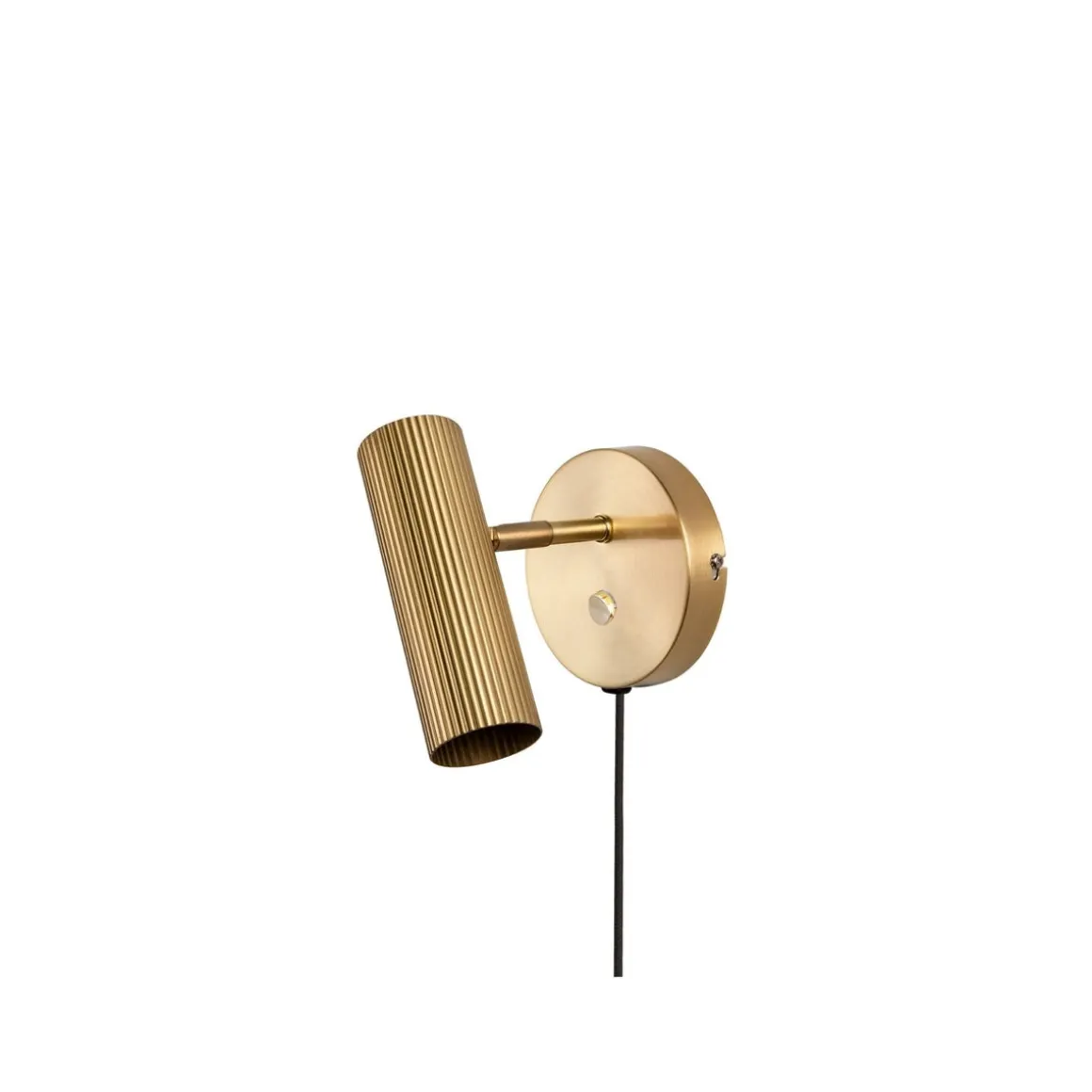 Lampen er laget i messing farget metall og har en 200 cm lang sort tekstilkabel og bryter (av/på, ingen dimmer) på veggplaten.