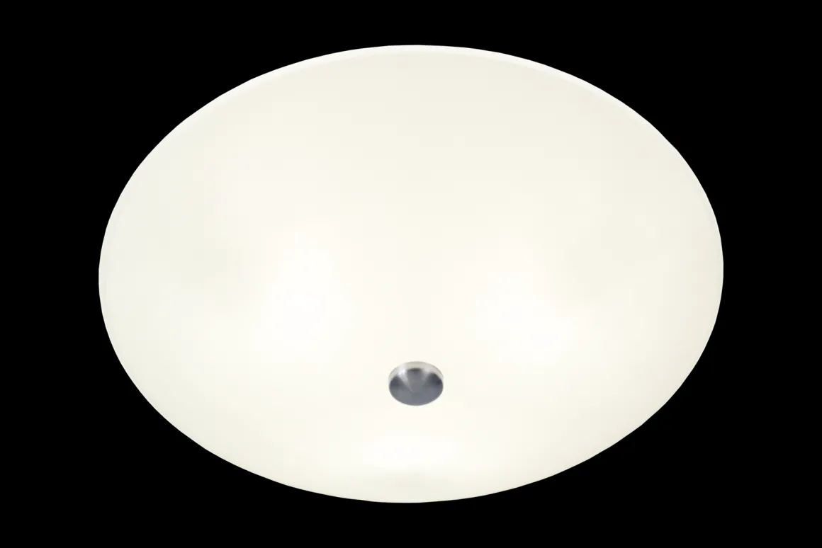 Iglo plafond med skjerm formet som en skål i hvitt glass og detalj i metall. Lampen monteres i taket med krokoppheng. Wattstyrke maks 3 x 40W. Strømtilkobling med koblingsklemme.