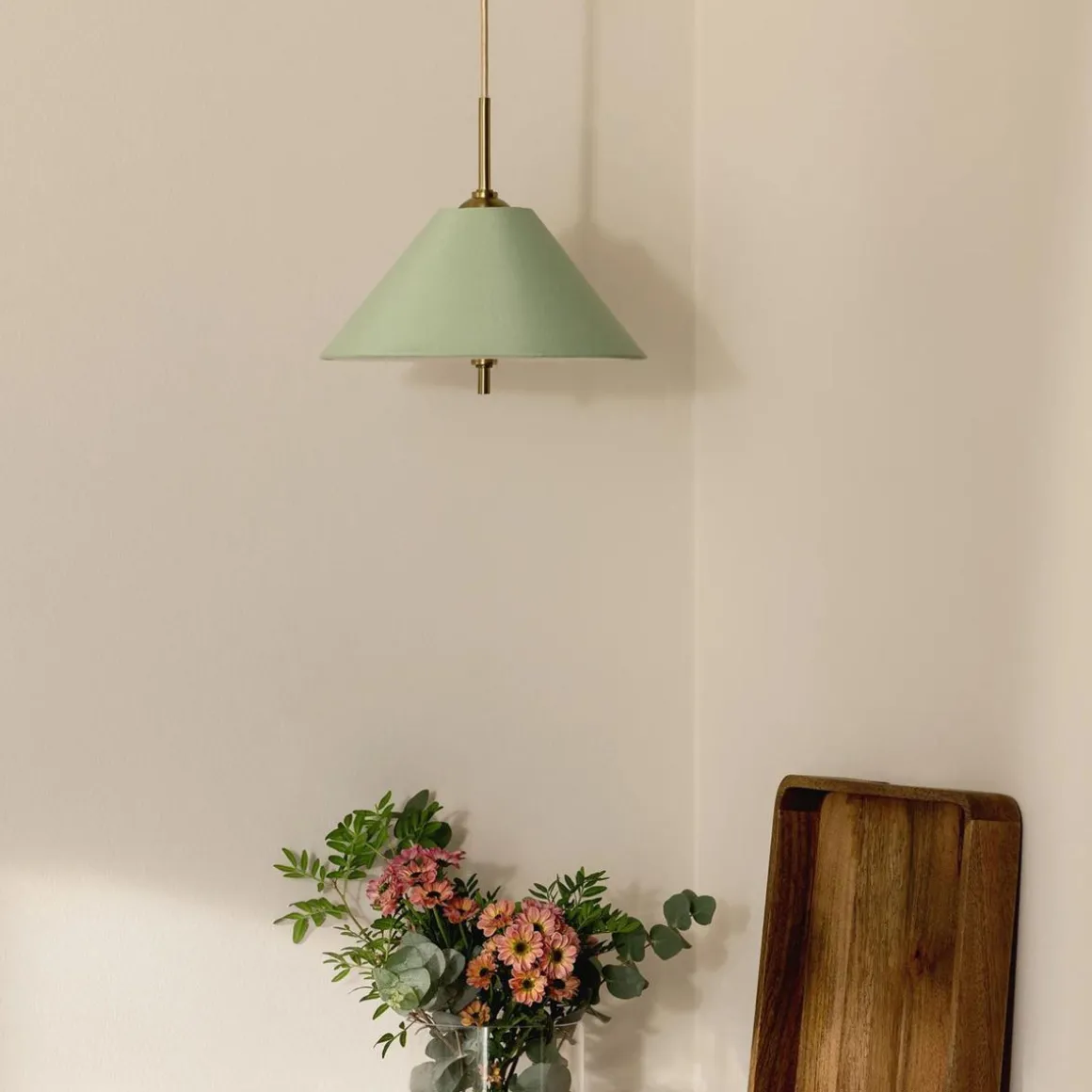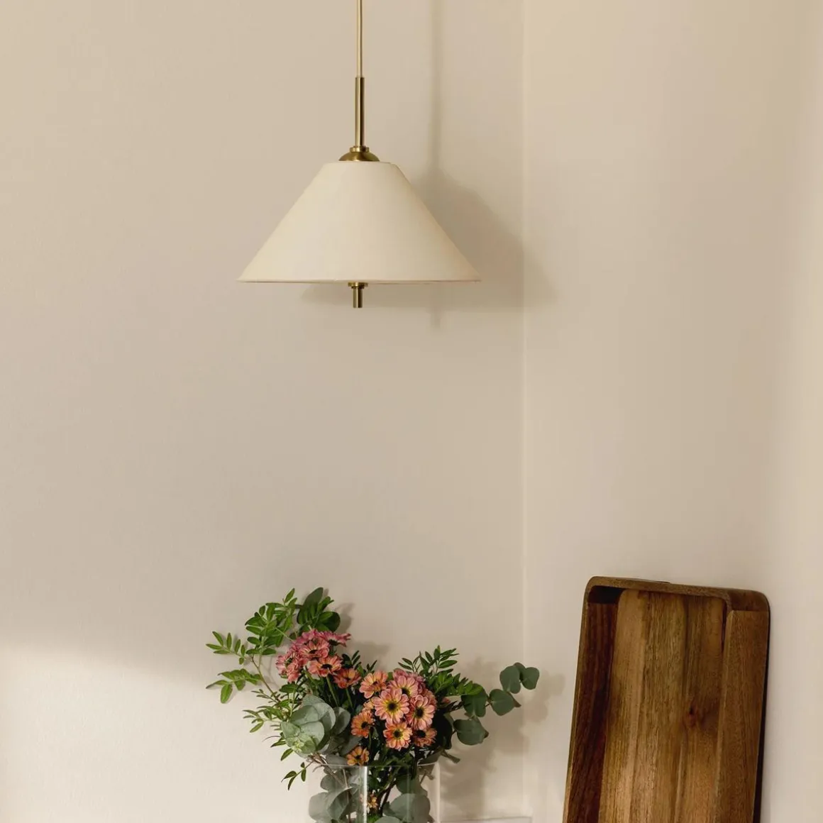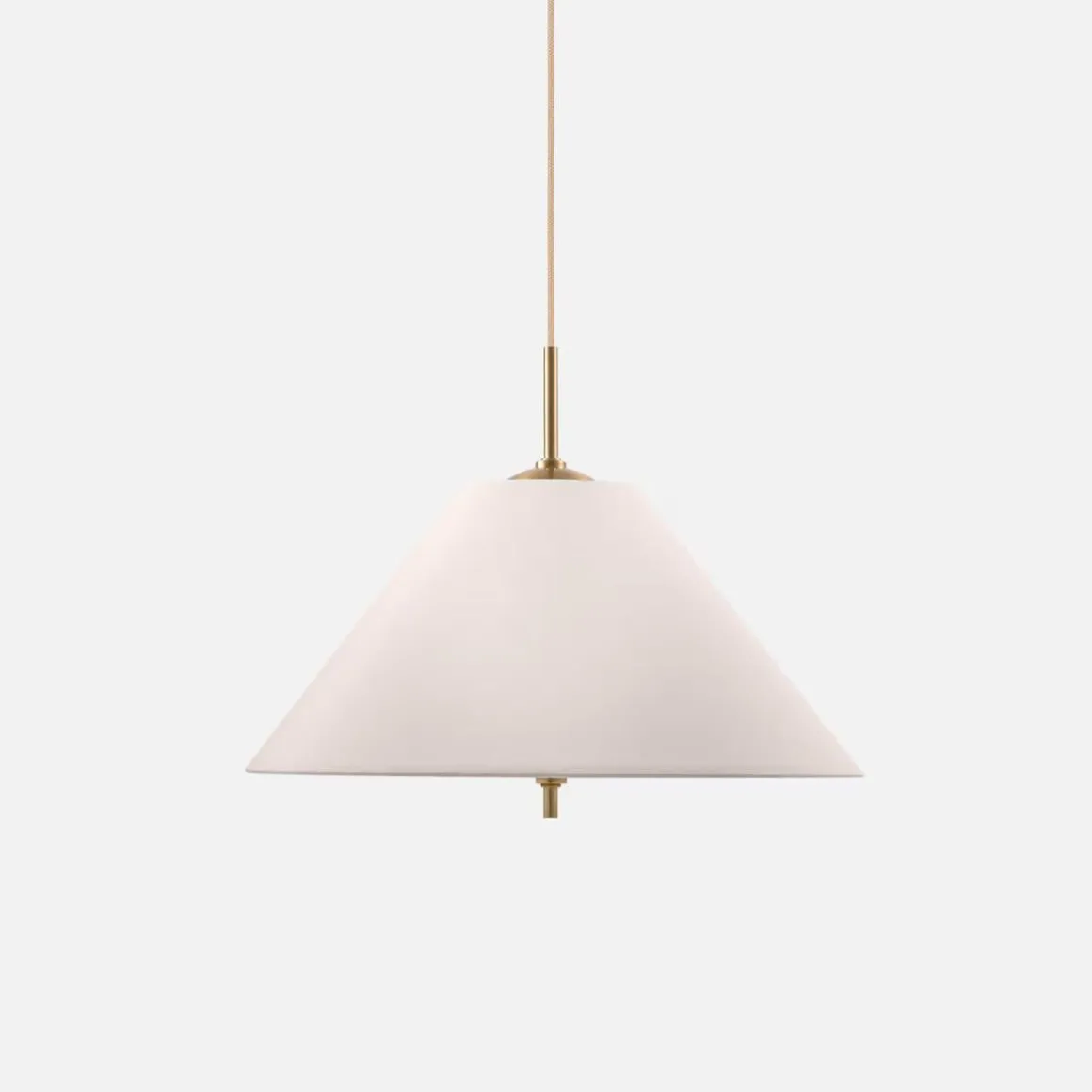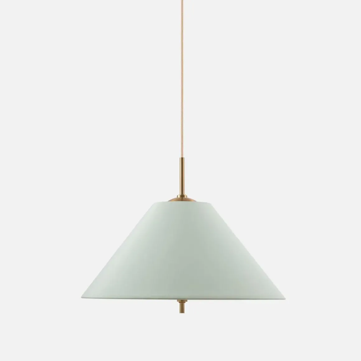 Iris-pendelen blir en vakker juvel i taket. Den nydelige tekstilskjermen er håndlaget av bomull og komplettert med messingsdetaljer.