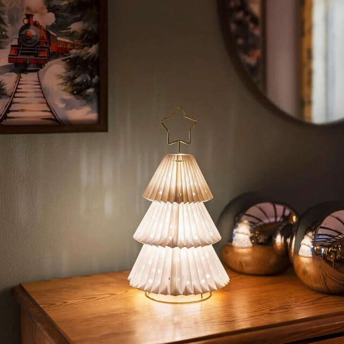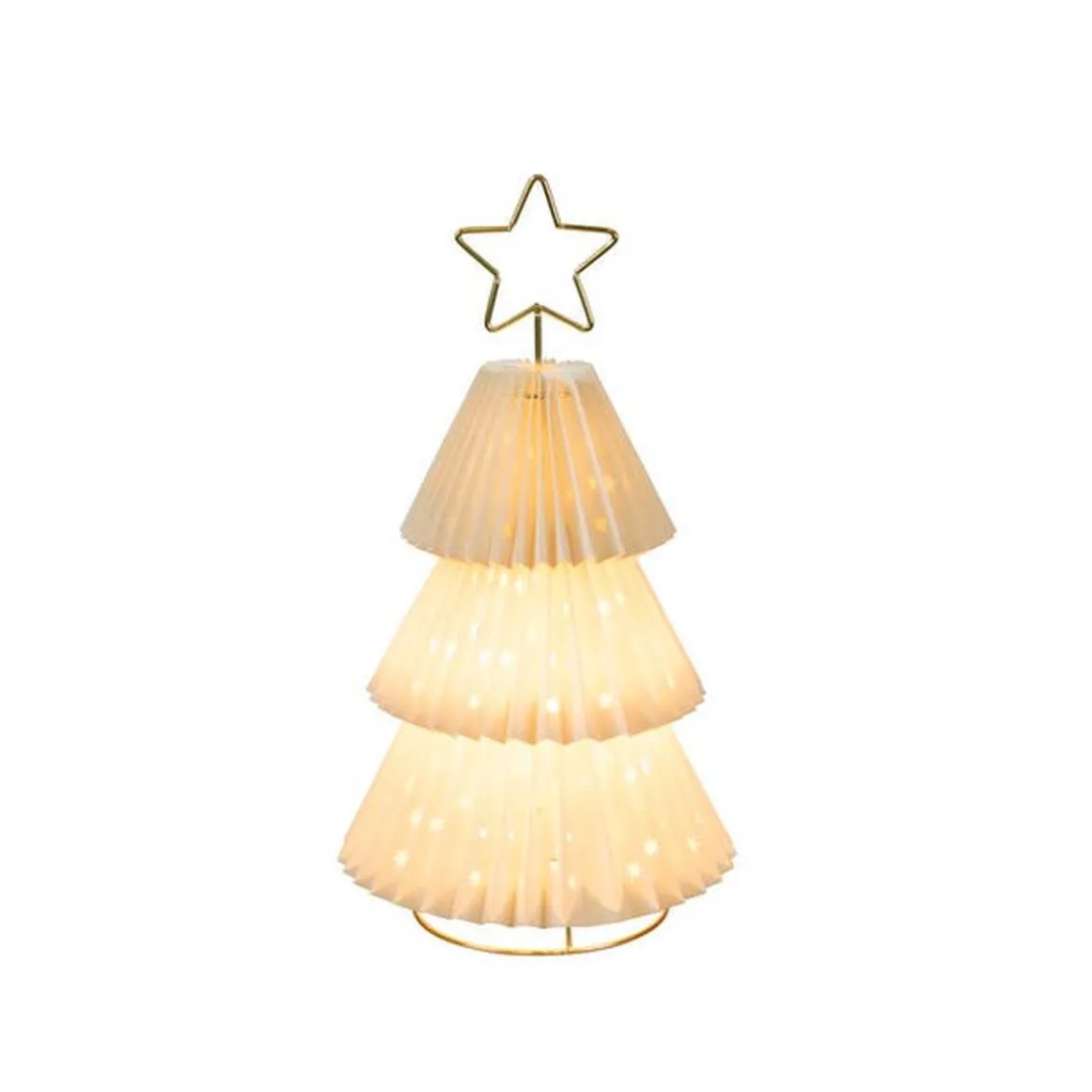 Dekorativ lampe formet som et grantre i plissert papir og messingfarget metall. Elegant design som sprer en myk og varm atmosfære i hjemmet ditt. Utstyrt med E14-sokkel og bryter for enkel bruk. Perfekt som en stemningsfull interiørdetalj, men kun for innendørs bruk.