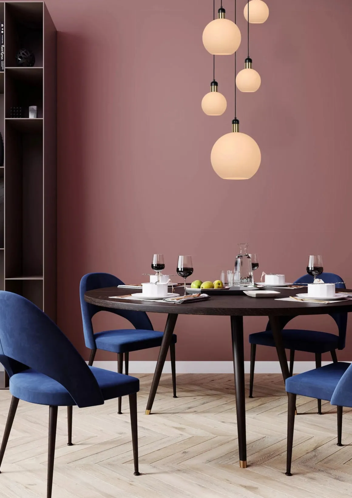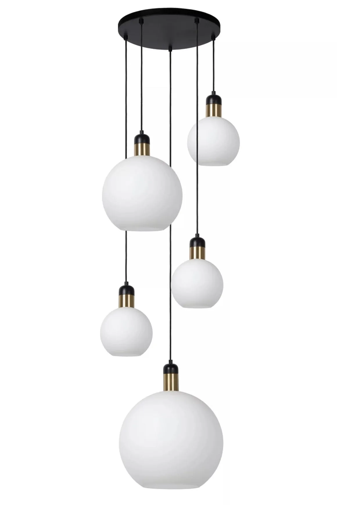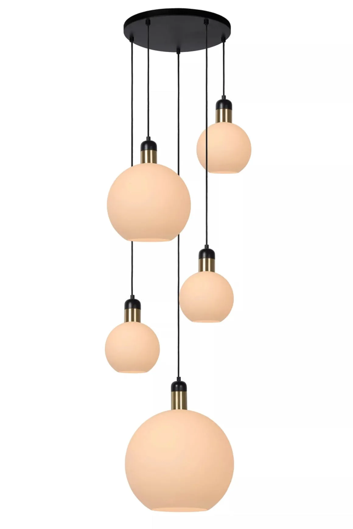 Julius er en nydelig taklampe som gir et flott blikkfang. Lampen leveres med 5 glasskuler i opal glass. Modellen finnes også som enkel pendel, skinne og gulvlampe.