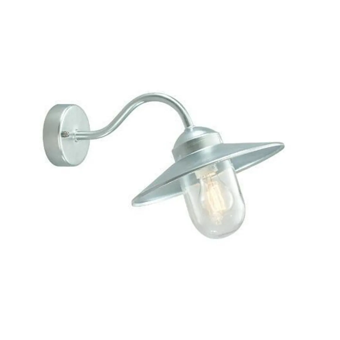 Vegglampe i moderne design. Klar kuppel. Opalhvitt, frostet eller klar kuppel i polykarbonat, samt hjørnefeste (art. 153) kan bestilles som tilbehør. Karlstad leveres i galvanisert stål og sort.