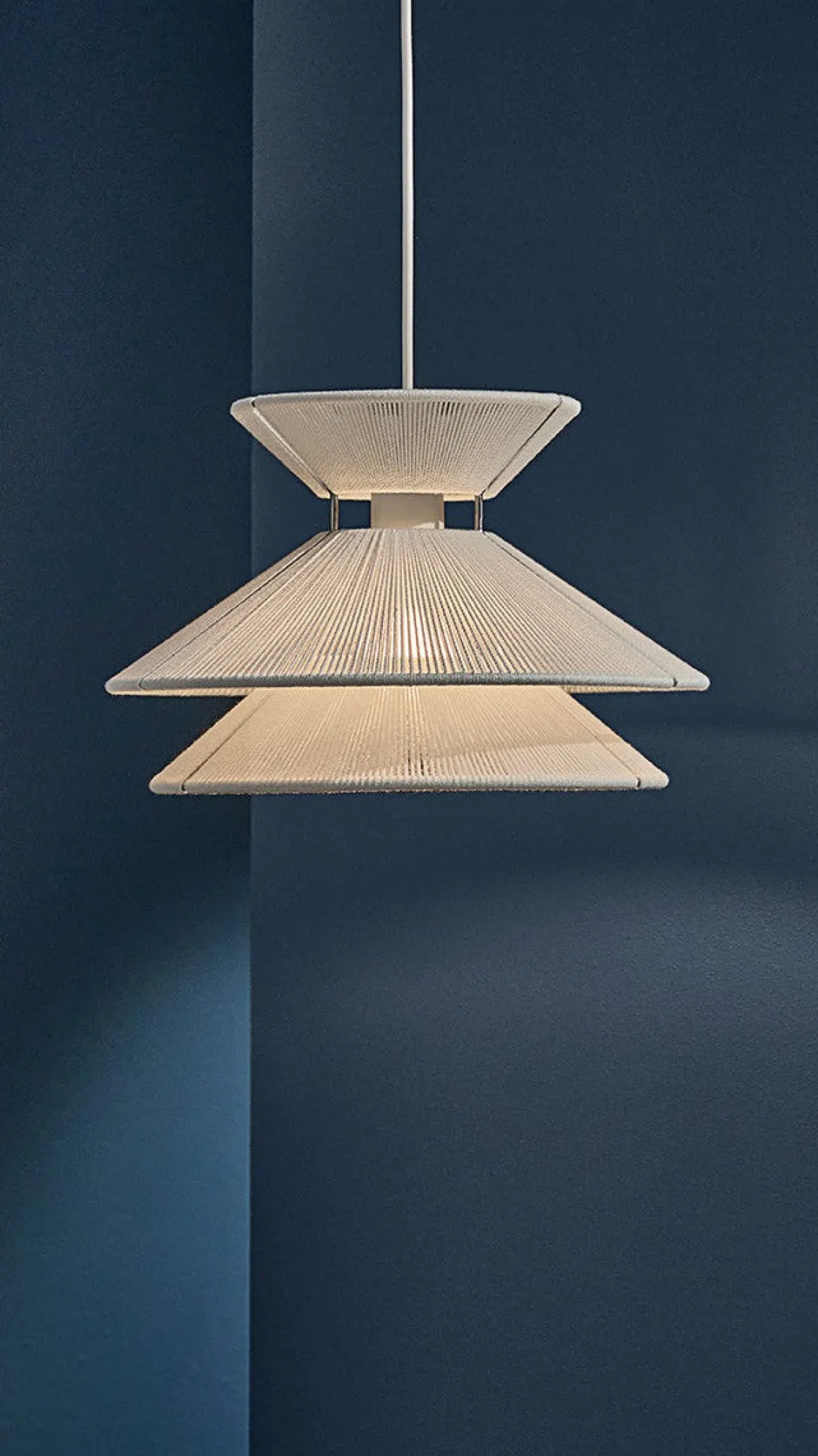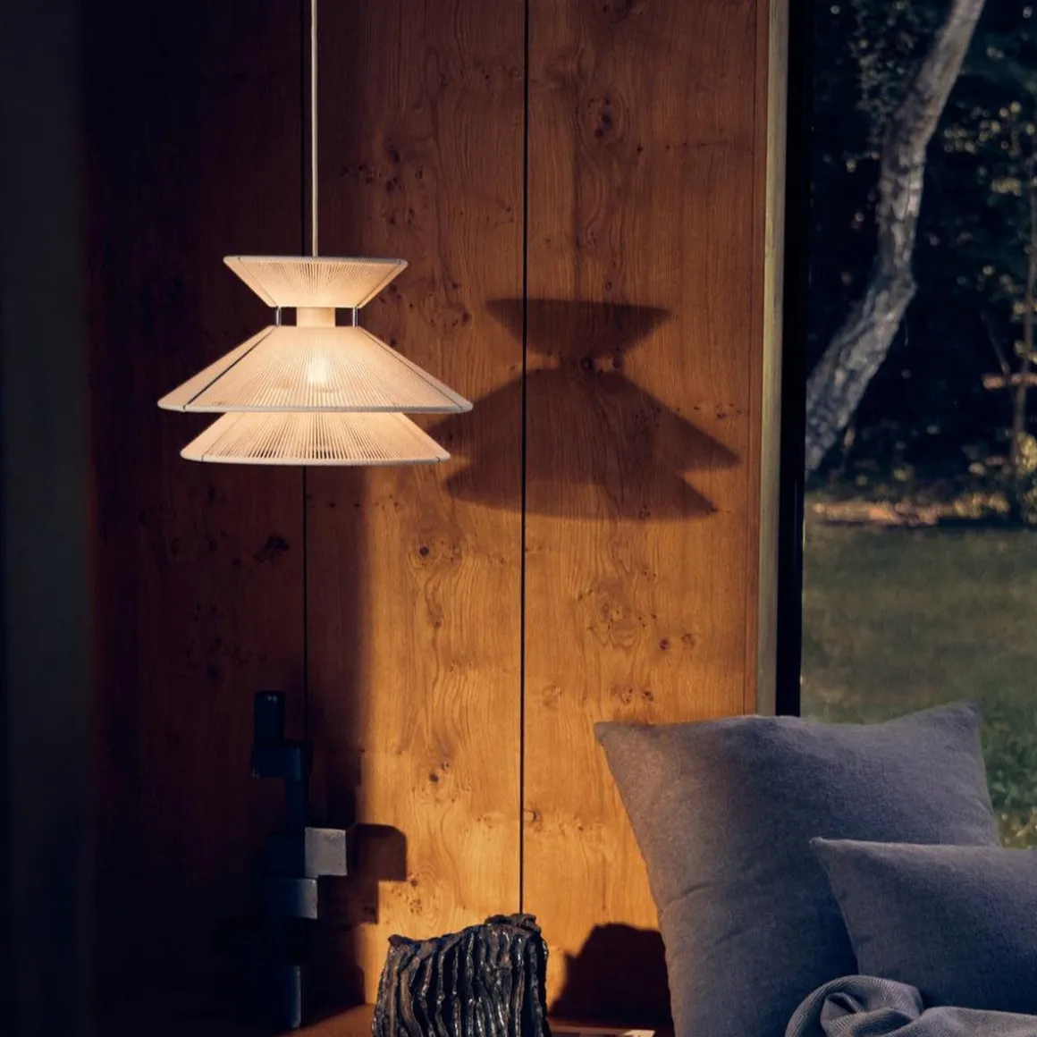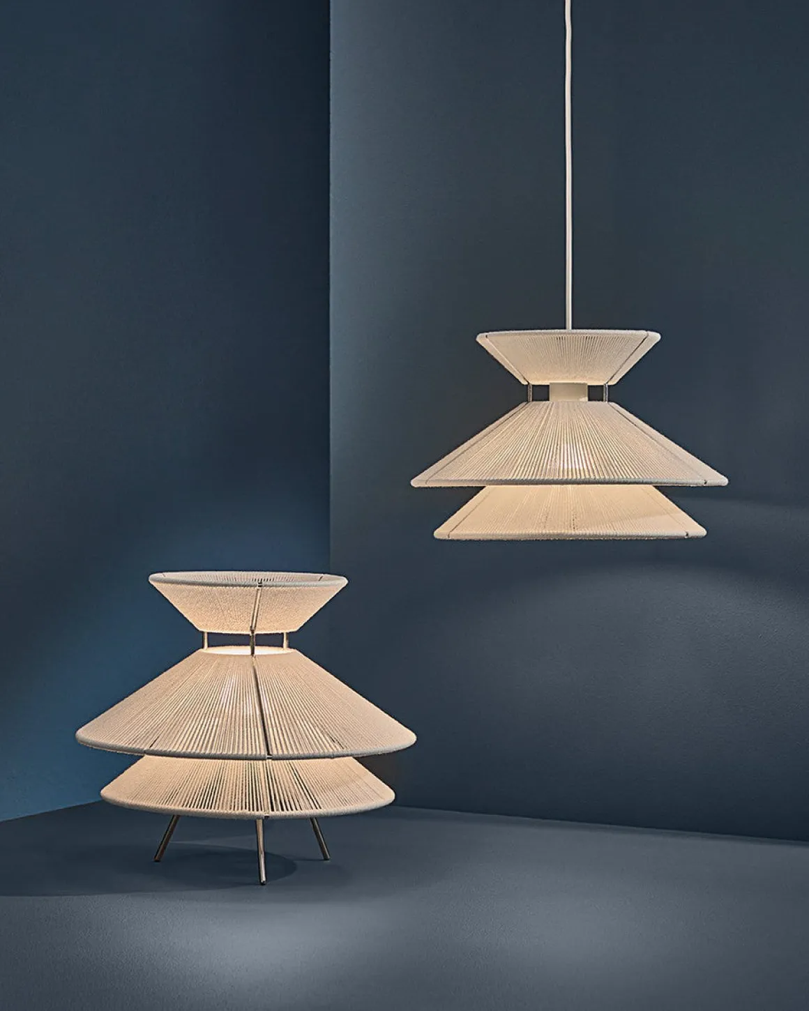 Tilgjengelig i både pendel og bordvarianter, er Kiku produsert av rustfritt stål og med linstrenger.