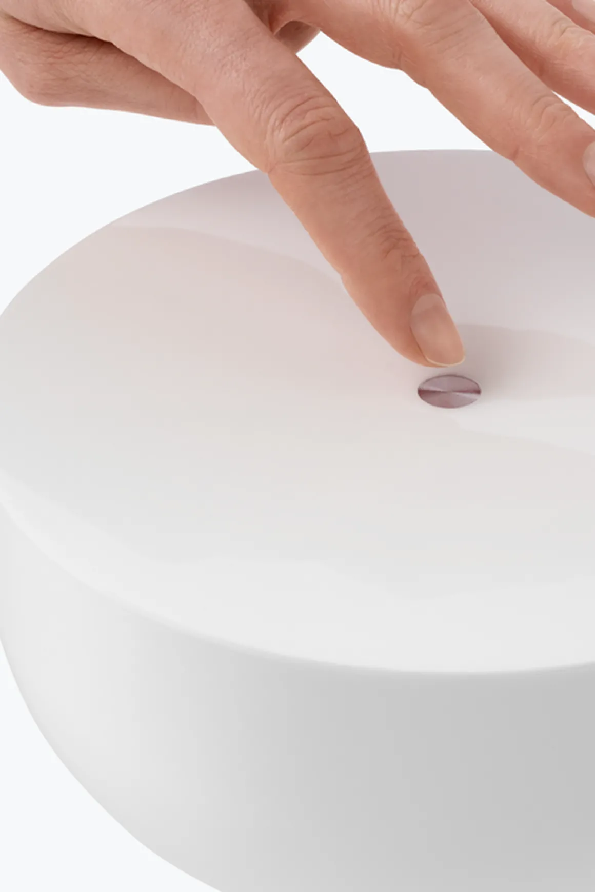 Ettersom lyset sprer seg fra hele den øvre delen av lampen, gir den lille bordlampen et høyt lysutbytte. En dreid forsenket metallsirkel på toppen av lampen tilfører en raffinert detalj til designet, og ved å banke forsiktig på sirkelen kan lyset dimmes til tre ulike nivåer. Den bærbare Kizu-bordlampen har en batterilevetid på 10 timer ved en lysinnstilling på 100 % og lades med en USB-C-kabel.