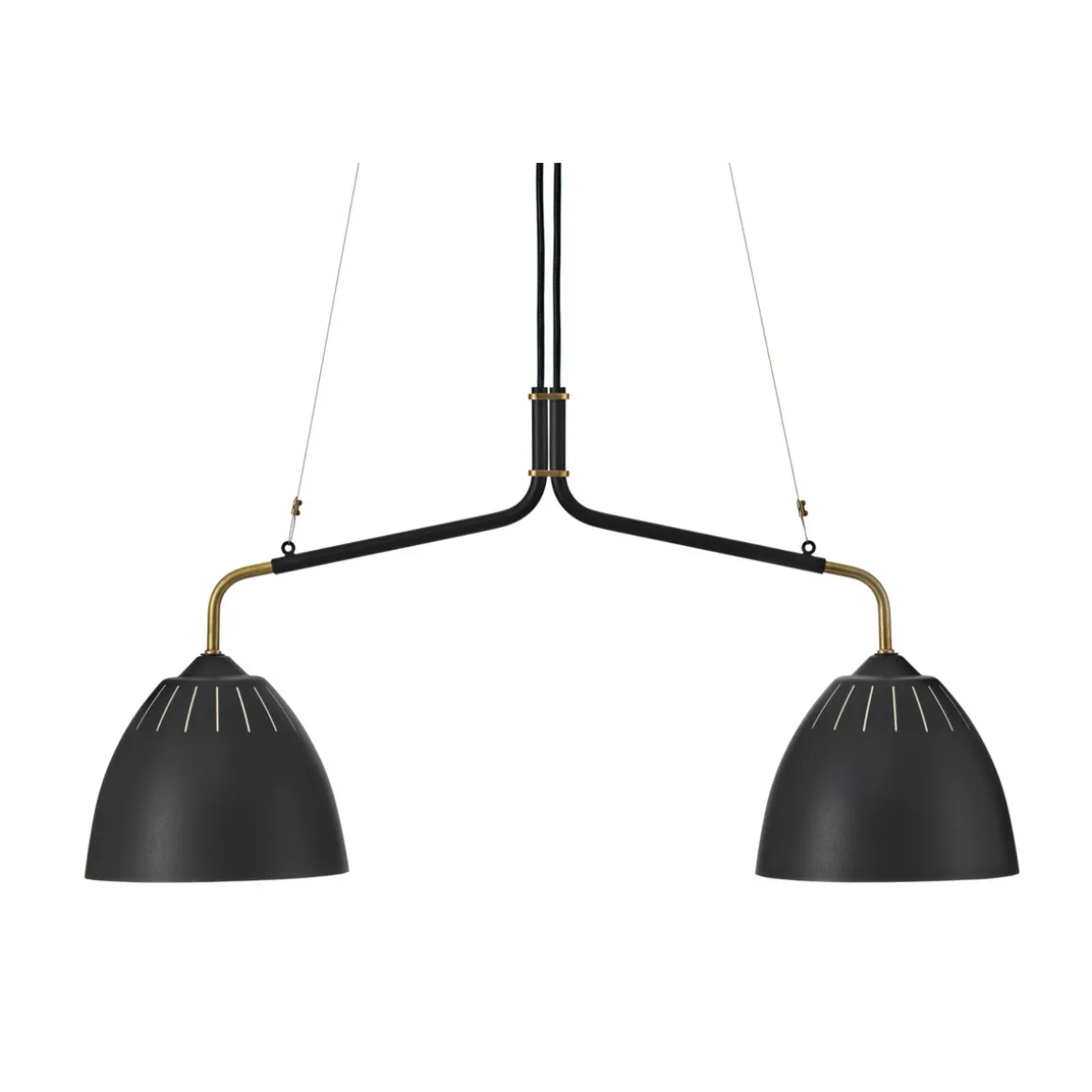 Lean er tilgjengelig i matt svart og hvit teksturfarge. Taklampen med to lyskilder, sprer lyset fint over spisebordet og tilfører en fin formdetalj til rommet. Små solide brett i rå messing følger med i wireopphenget og blir en flott ekstra detalj.