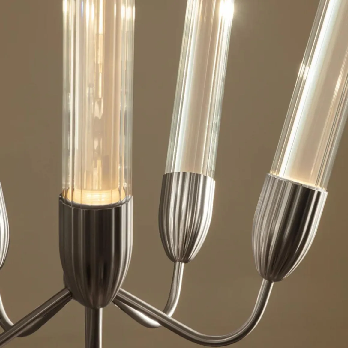 Den unike teksturen på glasset fanger lyset, mens en diffuser i kjernen av hvert lystråd sikrer myk og jevn belysning som skaper en innbydende atmosfære for enhver anledning.