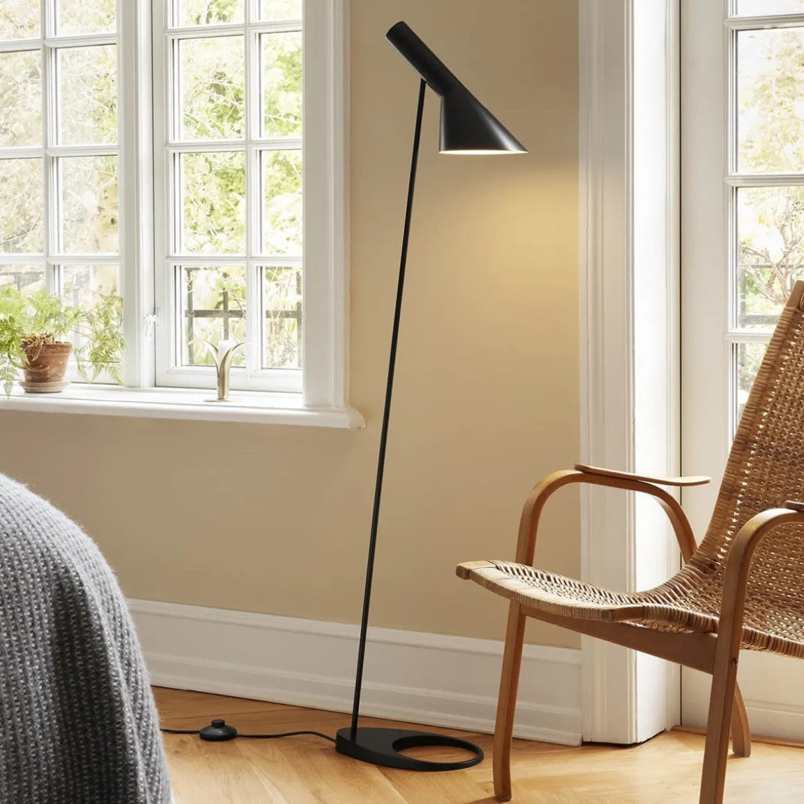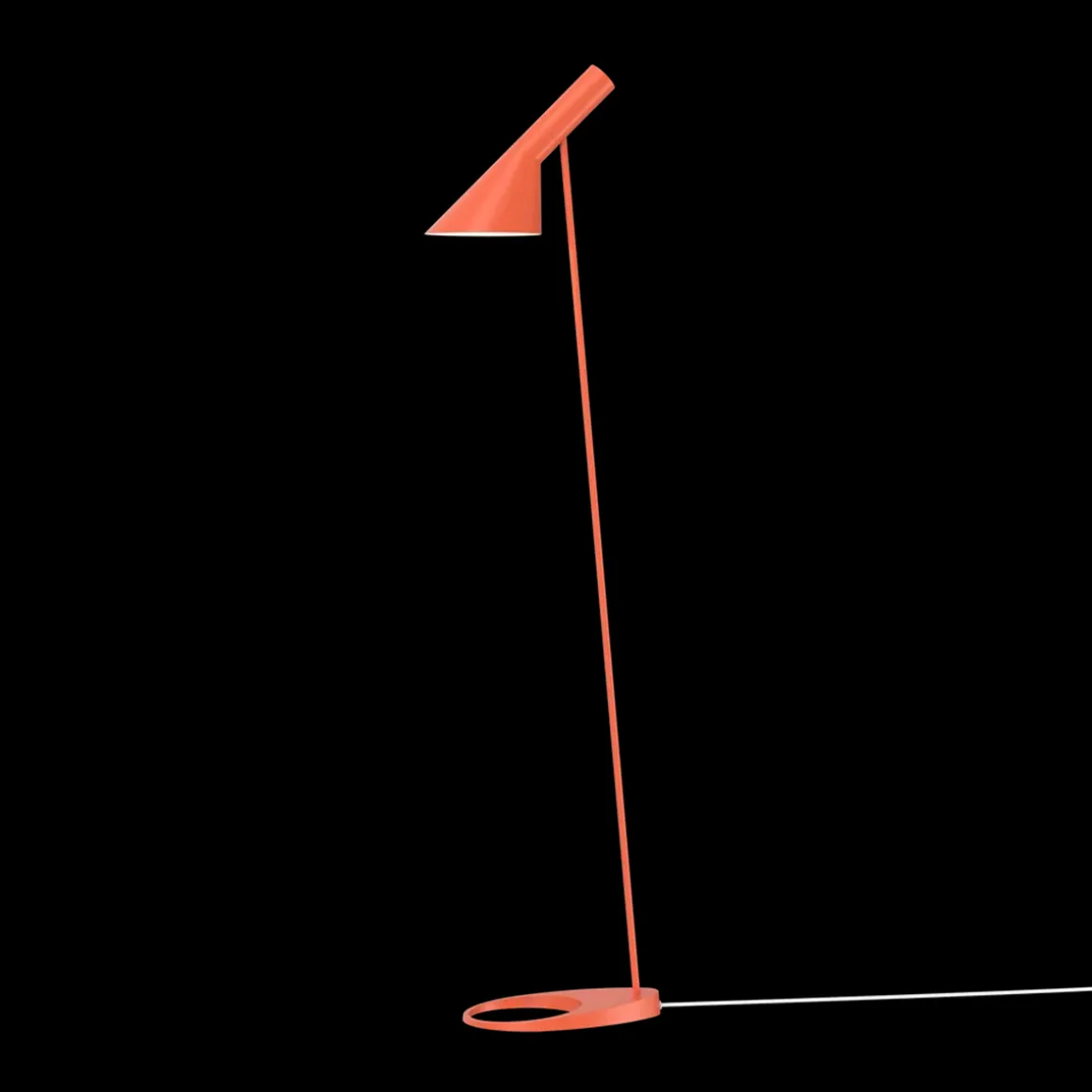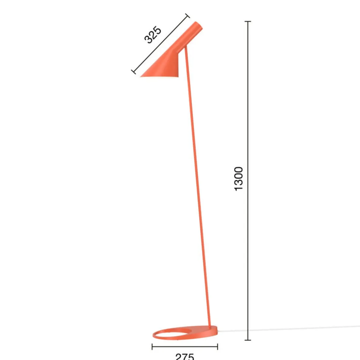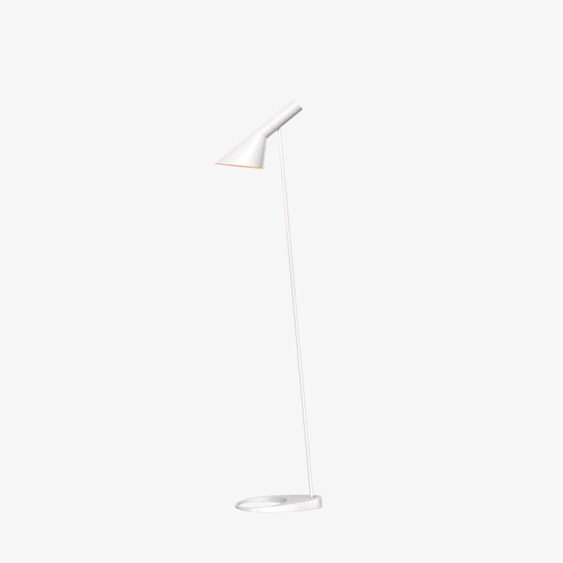 AJ gulvlampe inngår i AJ-serien, ansett som den designen som den danske arkitekten er mest kjent for over hele verden. Lampen sender ut et nedadrettet lys. Vinkelen på skjermen kan justeres for å optimalisere lysfordelingen. Skjermen er malt hvit på innsiden for å gi et mykt og komfortabelt lys.