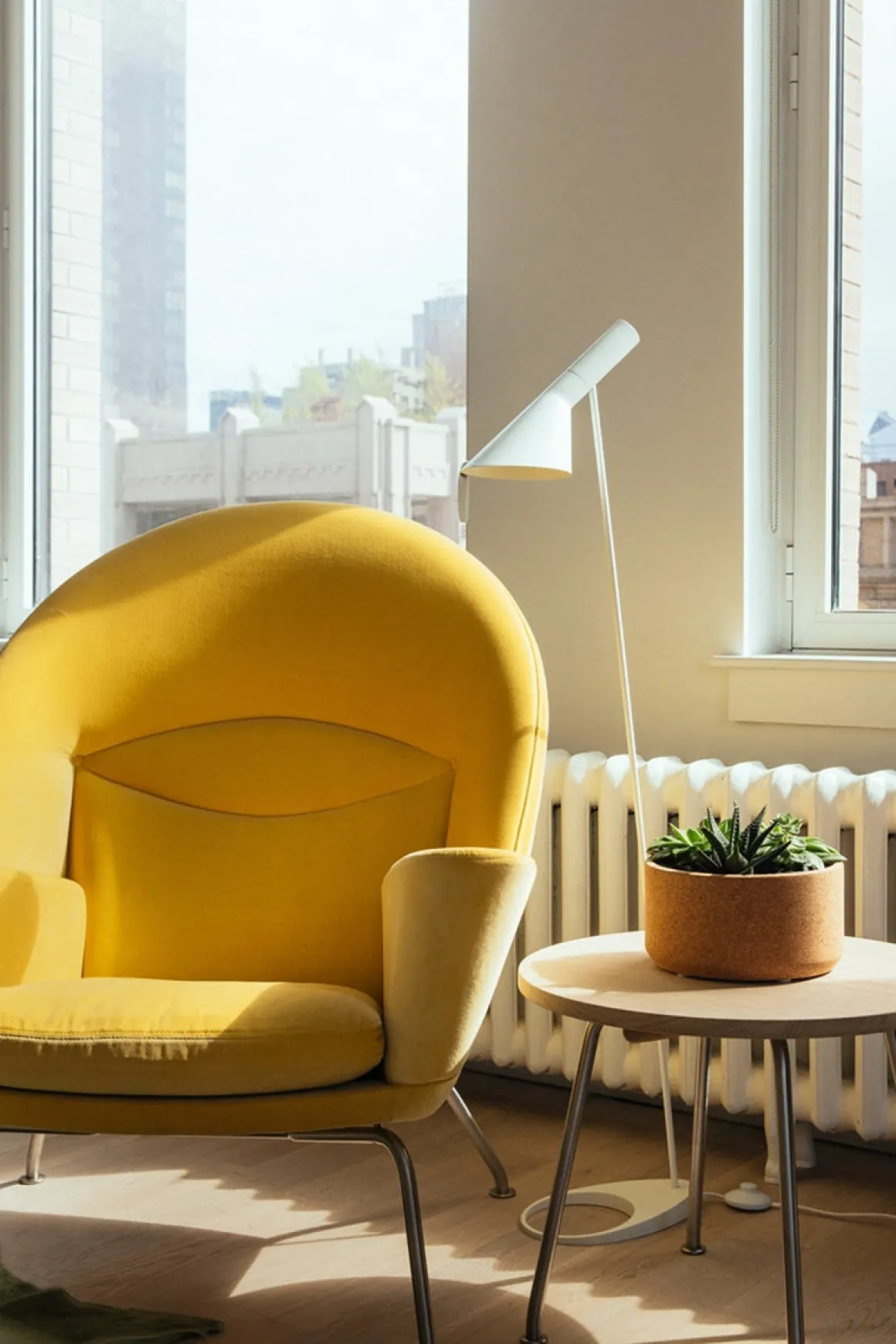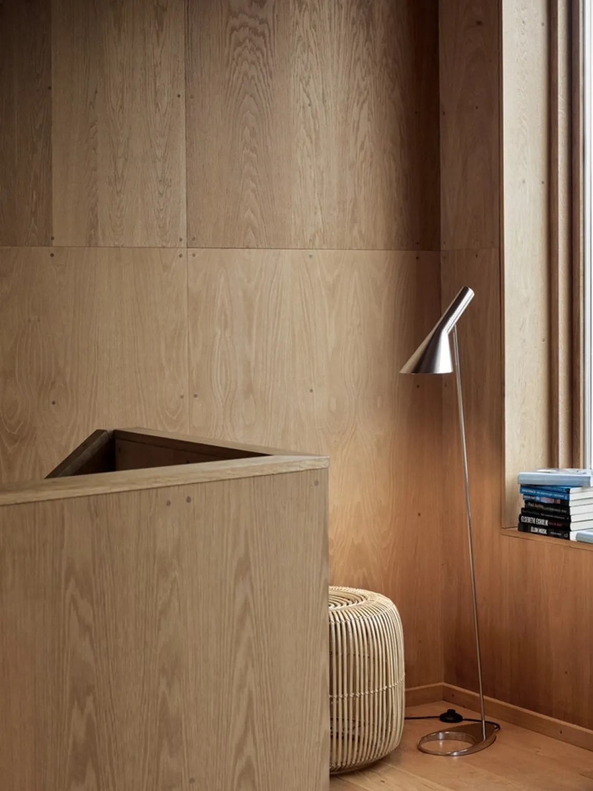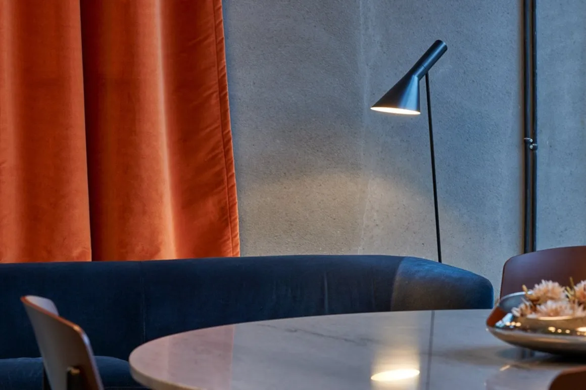 Arne Jacobsen designet AJ-lampen for SAS Royal Hotel i København (Radisson Collection) i 1957. I dag er AJ-serien ansett som den designen som den danske arkitekten er mest kjent for over hele verden. På den tiden bestod AJ-serien av en bord- og en gulvlampe, samt en vegglampe, en liten bordlampe og en bordlampe som ble designet for å festes til bordet. Vegglampen kunne ses i vakre rader av rustfritt stål i lobbyen da hotellet ble åpnet i 1960. I kombinasjon med pendelen AJ Royal, utgjorde AJ-lampen en del av det generelle designkonseptet som Jacobsen skapte for hotellet. Arne Jacobsen designet ikke bare hotellet ned til minste detalj for SAS (Scandinavian Airlines), han designet også nesten alle hotellets opprinnelige møbler og nyttegjenstander. Profilen til AJ-lampen, med dens rette linjer og kombinasjon av skrå og rette vinkler, er ikke bare sett på som en formell parallell til profilen til setene i 3300-serien, men også til de geometriske profilene i bygningene hans. AJ-lampen ble brukt i flere deler av hotellet, i kobber og rustfritt stål. I tillegg var den opprinnelig tilgjengelig i lys grå, mørk brun og svart, akkurat som AJ Pendel. Nye farger har siden blitt innført i løpet av årene for å feire seriens jubileer. I 2020 ble 60-årsjubileet for åpningen av SAS Royal Hotel feiret med gjeninnføringen av AJ Bord Mini, som ser spesielt bra ut i en vinduskarm, på et nattbord eller i kombinasjon med andre sporadiske møbler. I tillegg ble alle versjonene av AJ-lampen introdusert på nytt i den opprinnelige versjonen i rustfritt stål, som gjenspeiler omgivelsene sine i Arne Jacobsens ånd og fremhever lampens minimalistiske og markante form og feilfrie belysning.