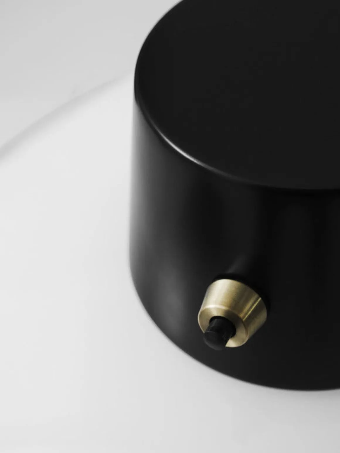 - Materiale: Skjerm: Hvitt opalt munnblåst trelagsglass. Stamme og toppskjerm: Stål. Monteringsenhet til stiftemontering: Aluminium. Mutter og fingerskrue i ubehandlet messing med tynne streker som går med urviseren. Vær oppmerksom på at ubehandlet messing utvikler patina over tid.