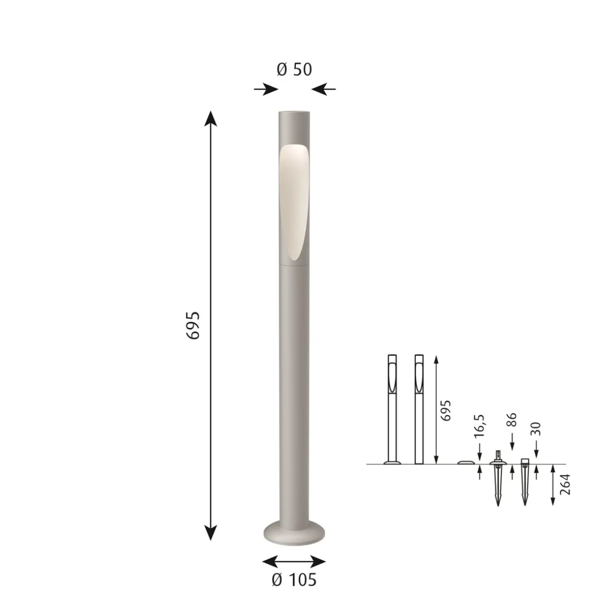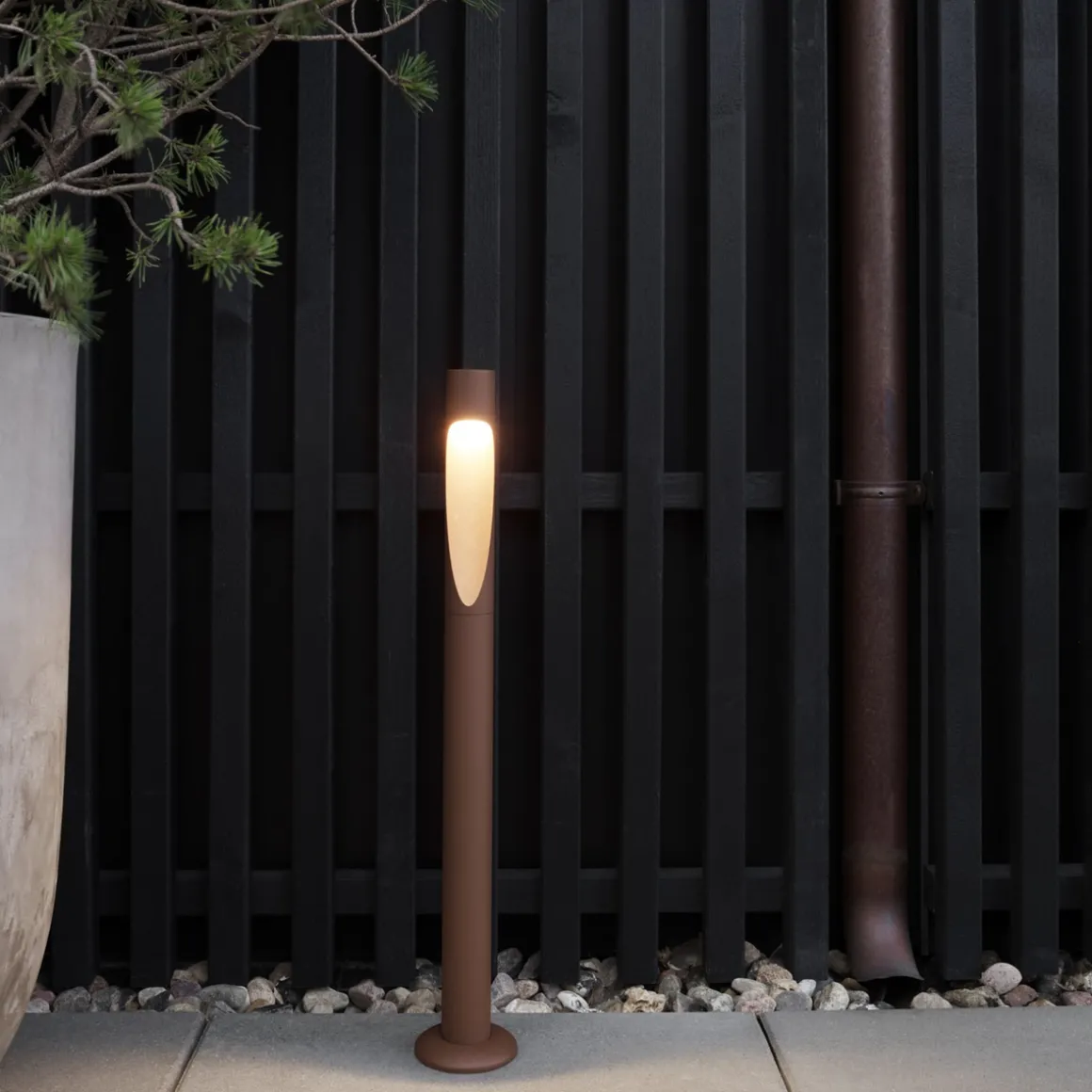Armaturen avgir et bredt, nedadrettet blendefritt lys. Lyskilden hviler på toppen inne i den asymmetriske utskjæringen på siden av pullerten, hvor gradienten fungerer som en reflektor som mykner lyset og danner en behagelig organisk form på bakken nedenfor.