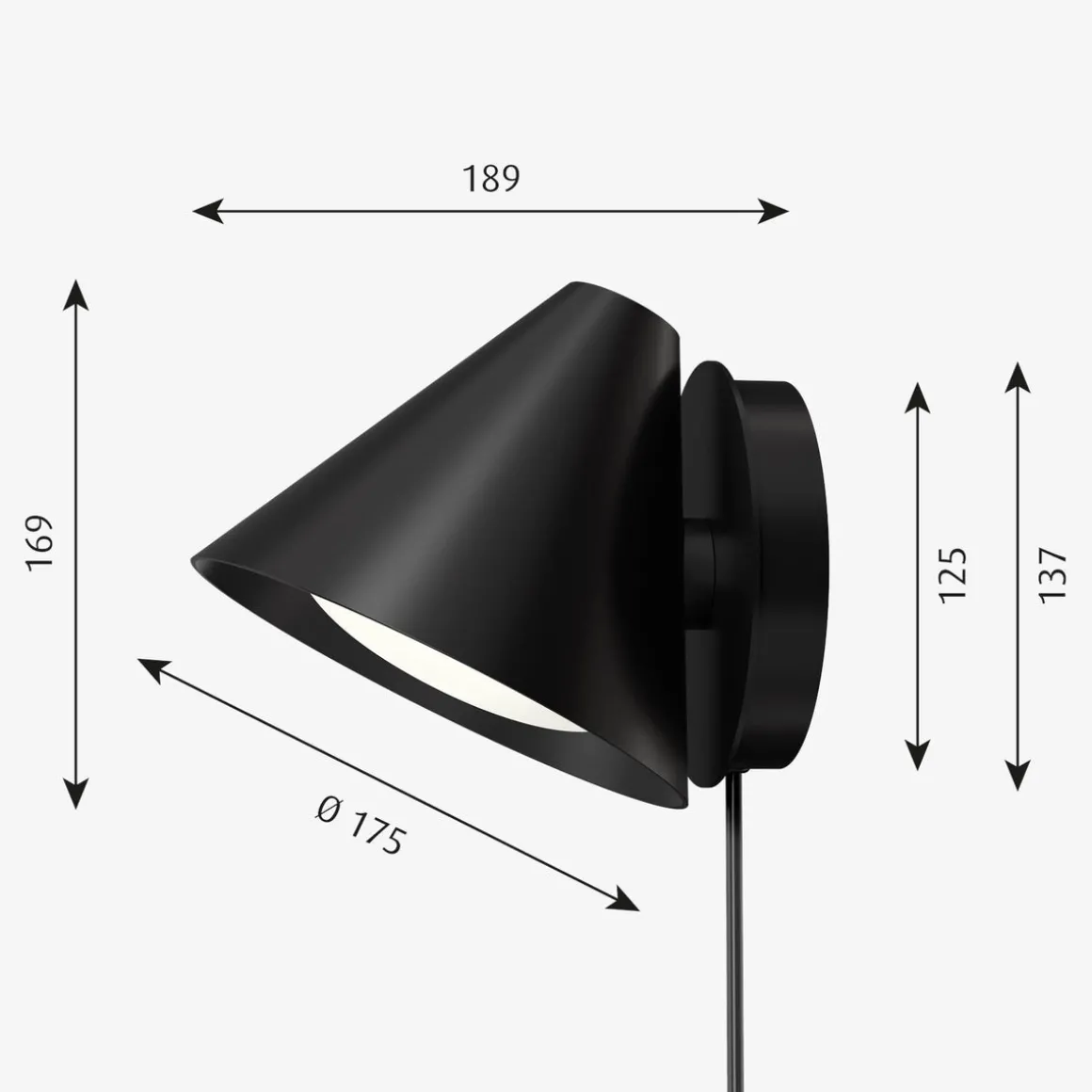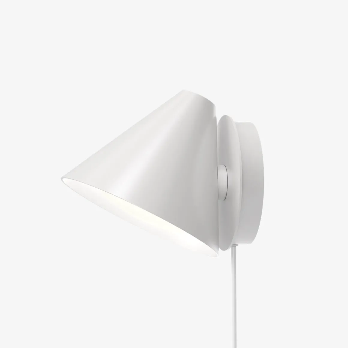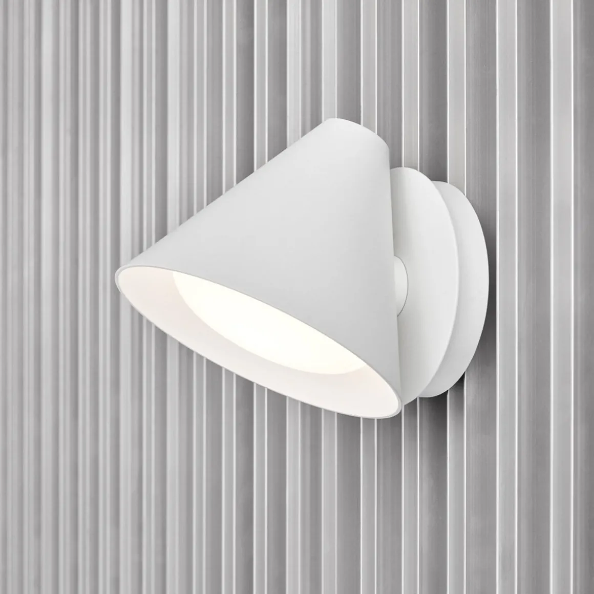 Vegglampens karakteristiske koniske skjerm har en innebygd buet avskjermer. Dette sikrer et attraktivt og blendefritt lys. Et svakt lys avgis også oppover gjennom en ensartet, diskré åpning i toppen av skjermen, for å gi en perfekt stemning. Armaturen kan monteres vendt nedover for å lede lyset eller oppover for en indirekte belysningsløsning. Den buede avskjermeren gir et glimt av innsiden av skjermen, samtidig som den reduserer eventuell blending. Keglen Vegg kan monteres for å lede lyset nedover eller oppover. Lampeskjermen er justerbar og kan rotere 45 grader til hver side for å rette lyset der det er nødvendig. Bryteren og dimmeren er plassert på sokkelen. På sokkelen kommer ledningen ut på siden eller armaturen kan monteres direkte på en stikkontakt.