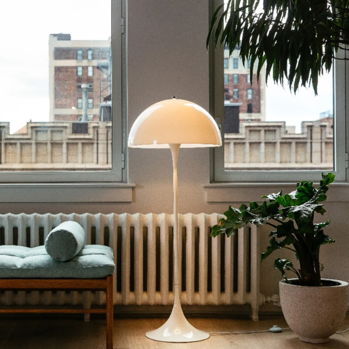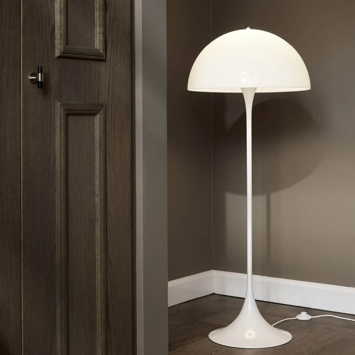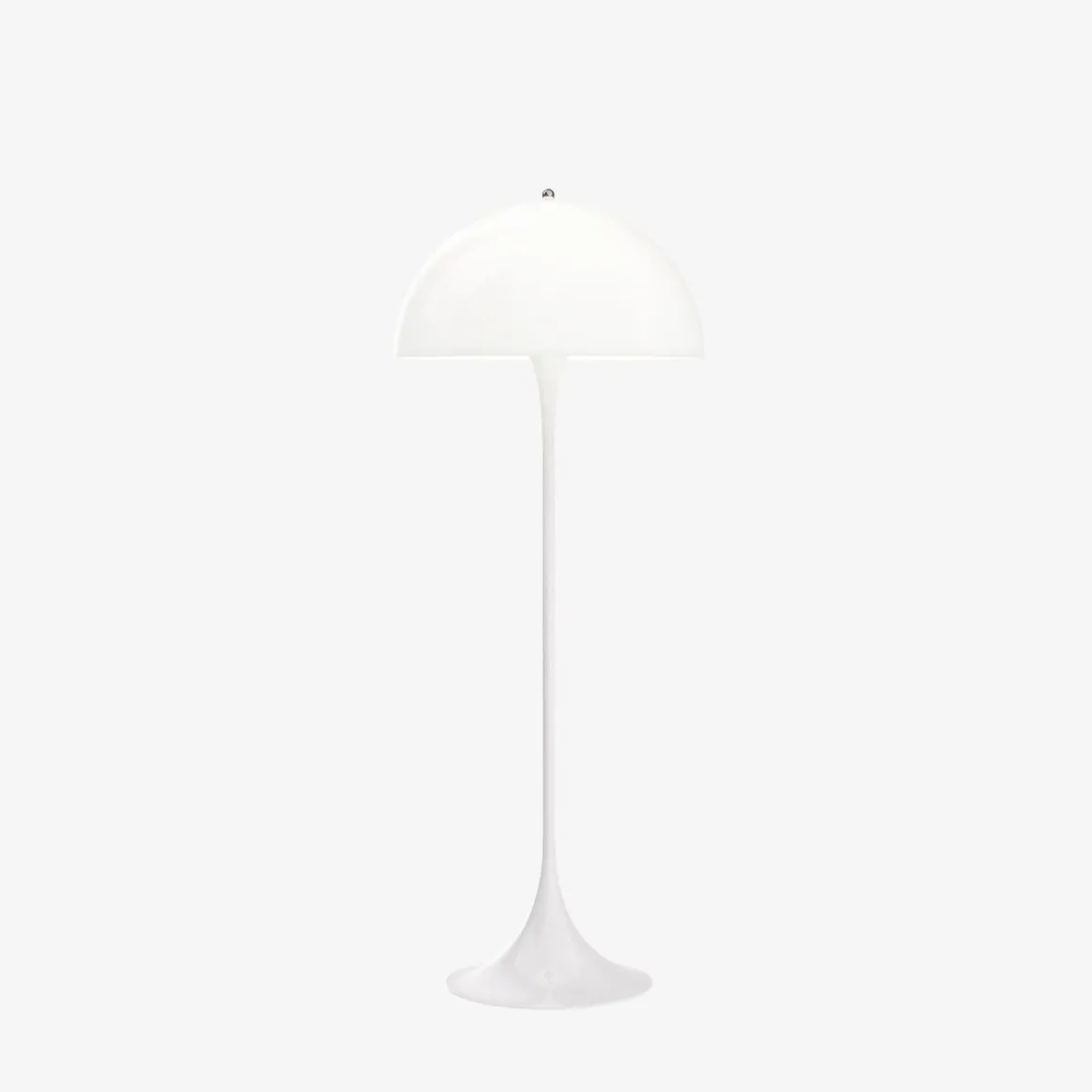 Med sitt blendefrie lys er Panthella gulvlampen et vakkert eksempel på Verner Pantons strålende sans for å skape stemningsfull belysning. Lampen gir alltid et høyt komfortnivå med mykt, diffust lys. Skjermen i opal/akryl etterlater en diffus, behagelig lysatmosfære på grunn av den gjennomskinnelige skjermen, den nedadgående refleksjonen fra den indre skjermen og refleksjonen fra trompetstammen.