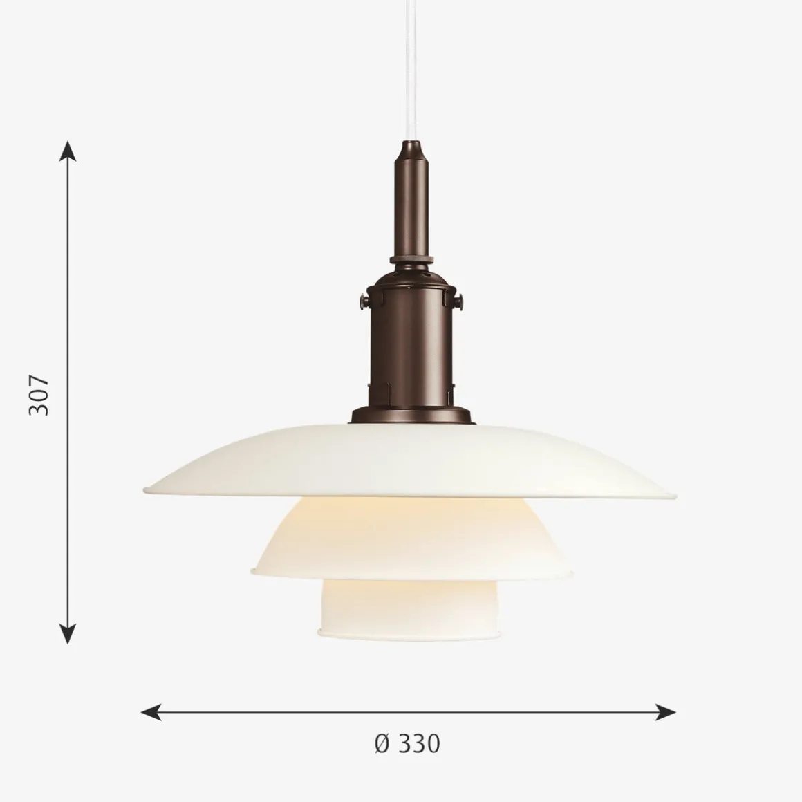 - Materiale: Skjermer: Munnblåst, hvitt opalt glass. Oppheng: metallisert messing, ekstrudert aluminium.