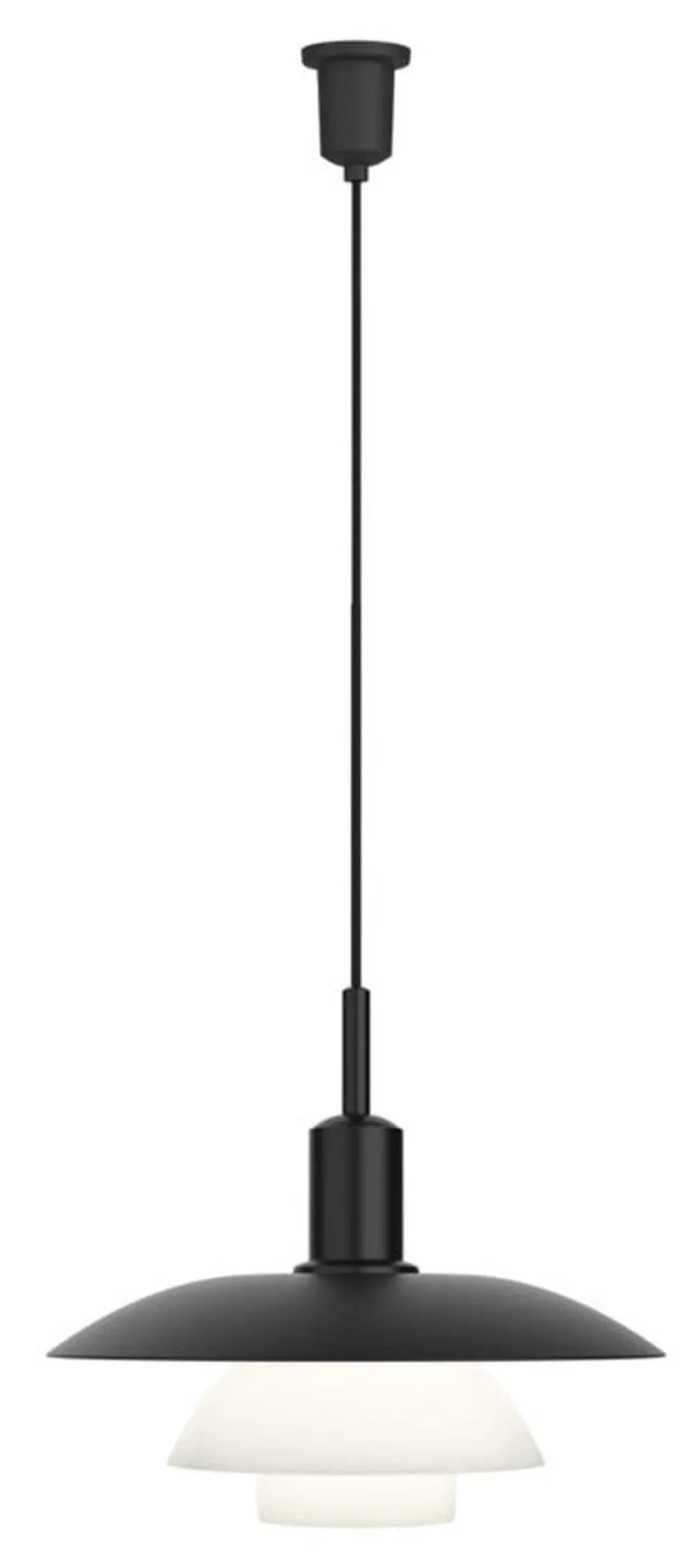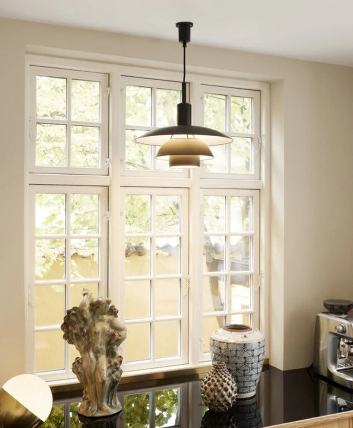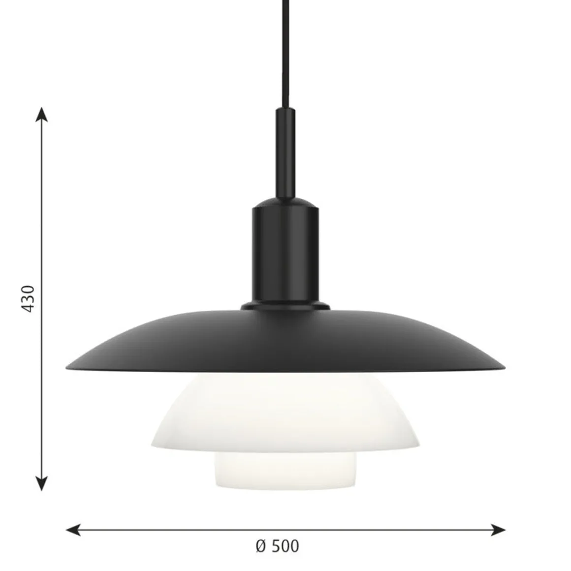 PH 5/5 lampen er en relansert versjon av Poul Henningsens original design i en monokrom fargepalett som gir et sterkt grafisk uttrykk. Skjermsettet er spesielt designet for å henges opp i høyden, noe som gjør den ideell for mange forskjellige bruk i hjemmet, inkludert ganger.