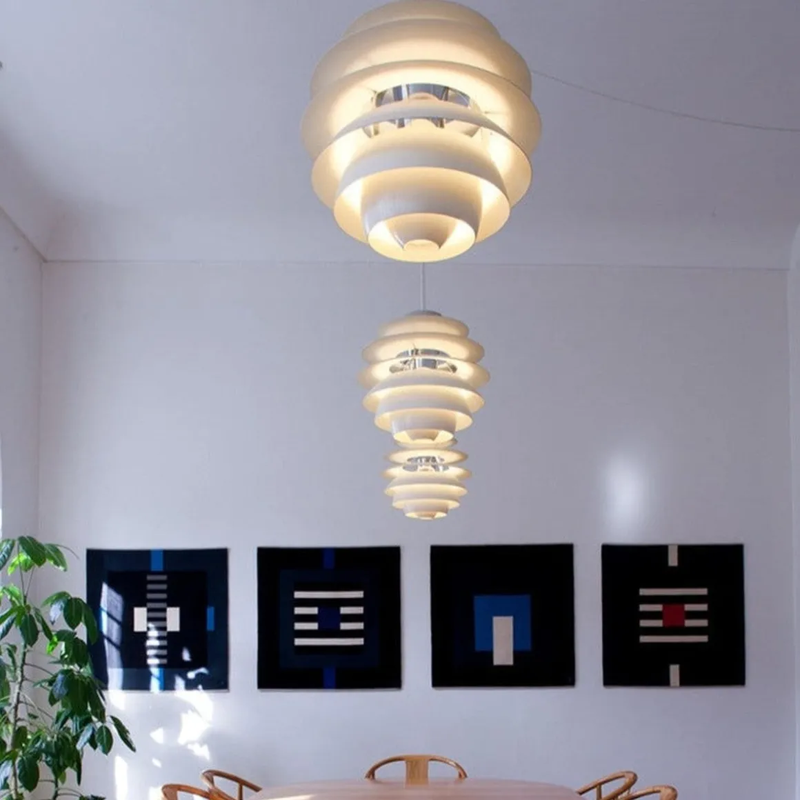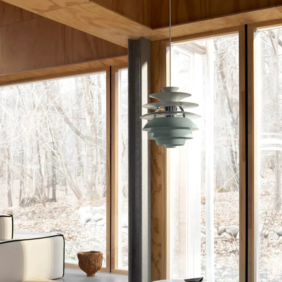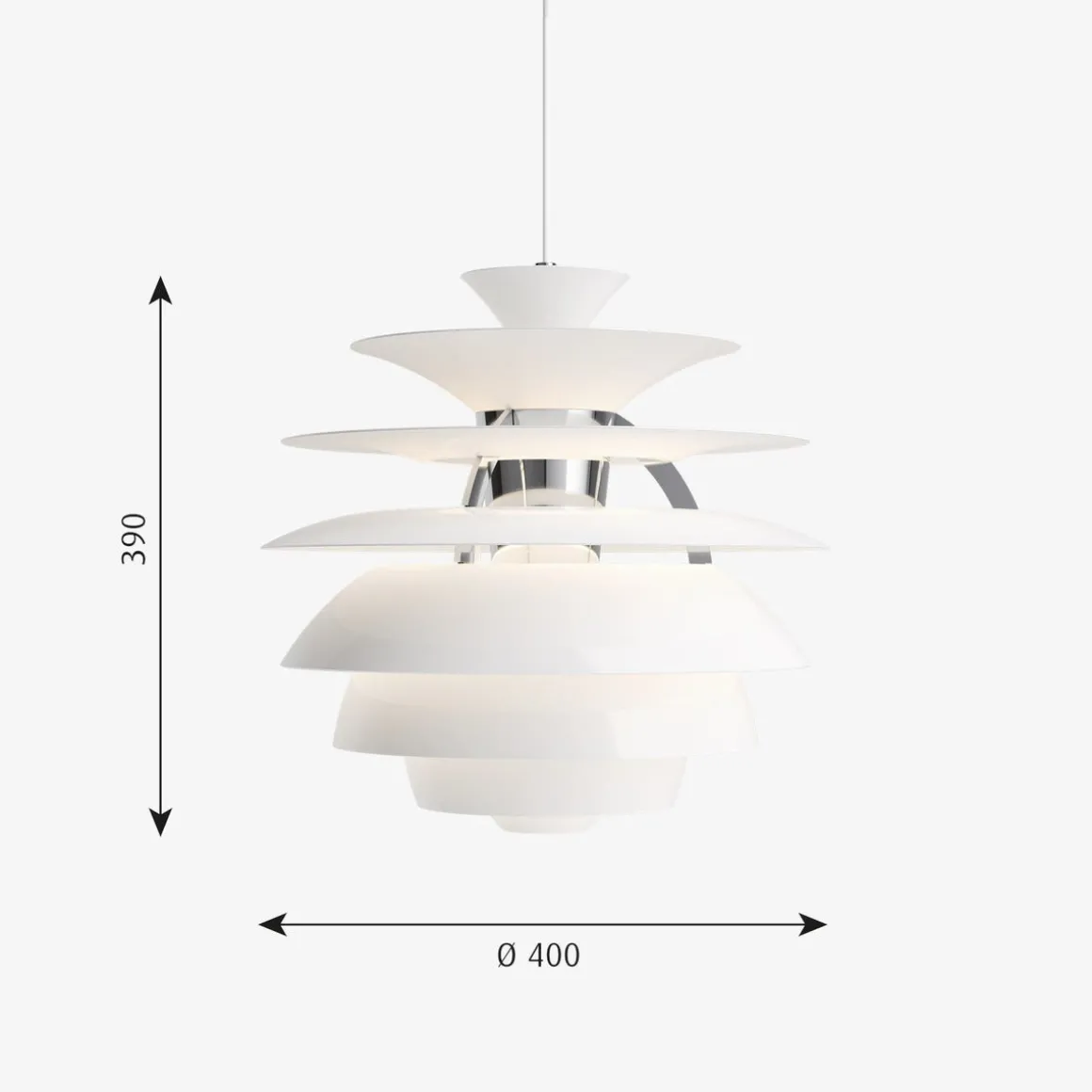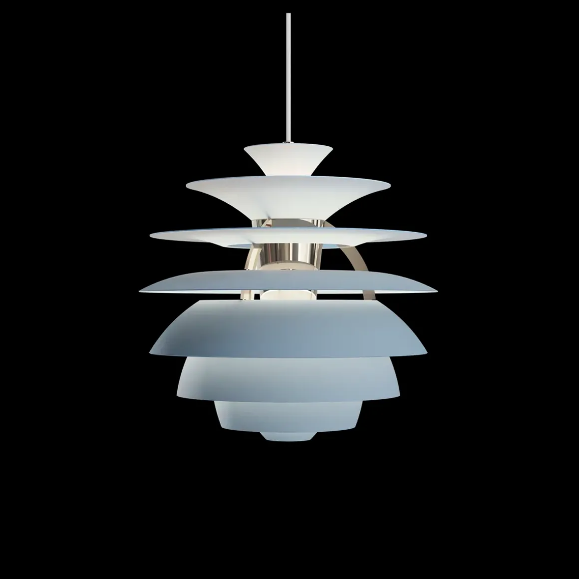 PH Snowball fra Louis Poulsen sender ut et komfortabelt og blendfritt dempet lys. Matte, malte undersider og blanke overflater gir en attraktiv refleksjon av det dempede lyset og skaper en jevn belysning rundt armaturen. Når lyset er slått på er den øverste delen opplyst mens den nederste delen forblir mørk.