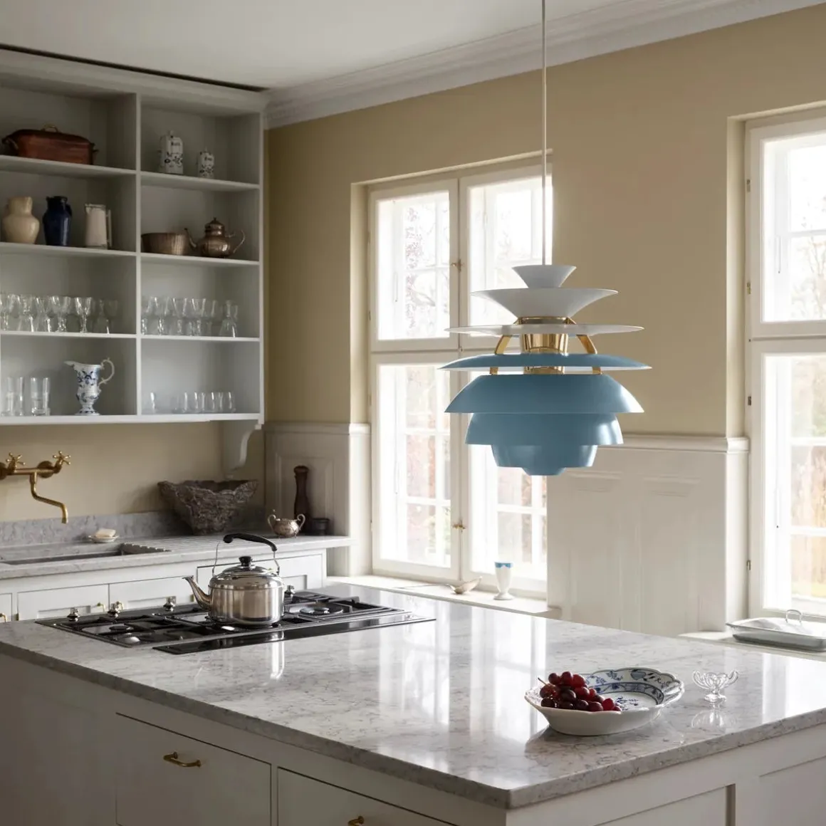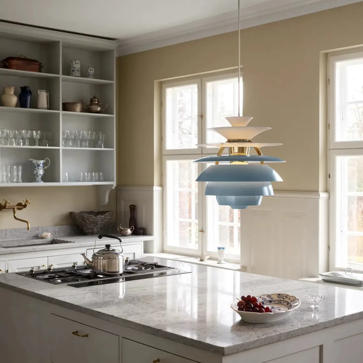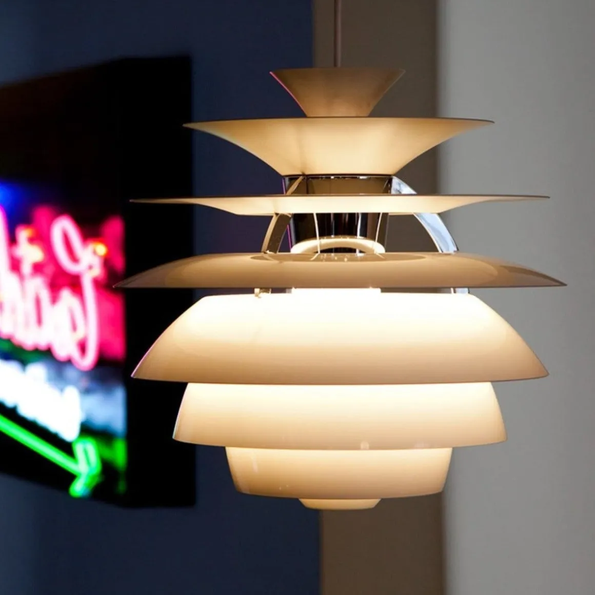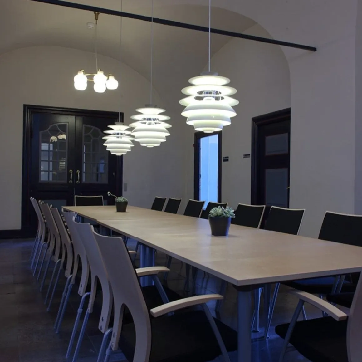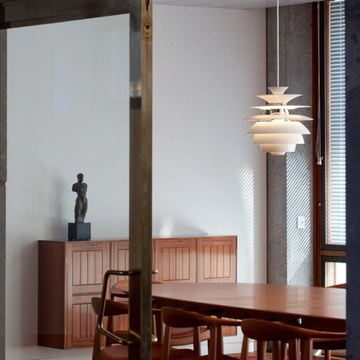 PH Snowball fra Louis Poulsen sender ut et komfortabelt og blendfritt dempet lys. Matte, malte undersider og blanke overflater gir en attraktiv refleksjon av det dempede lyset og skaper en jevn belysning rundt armaturen. Når lyset er slått på er den øverste delen opplyst mens den nederste delen forblir mørk.