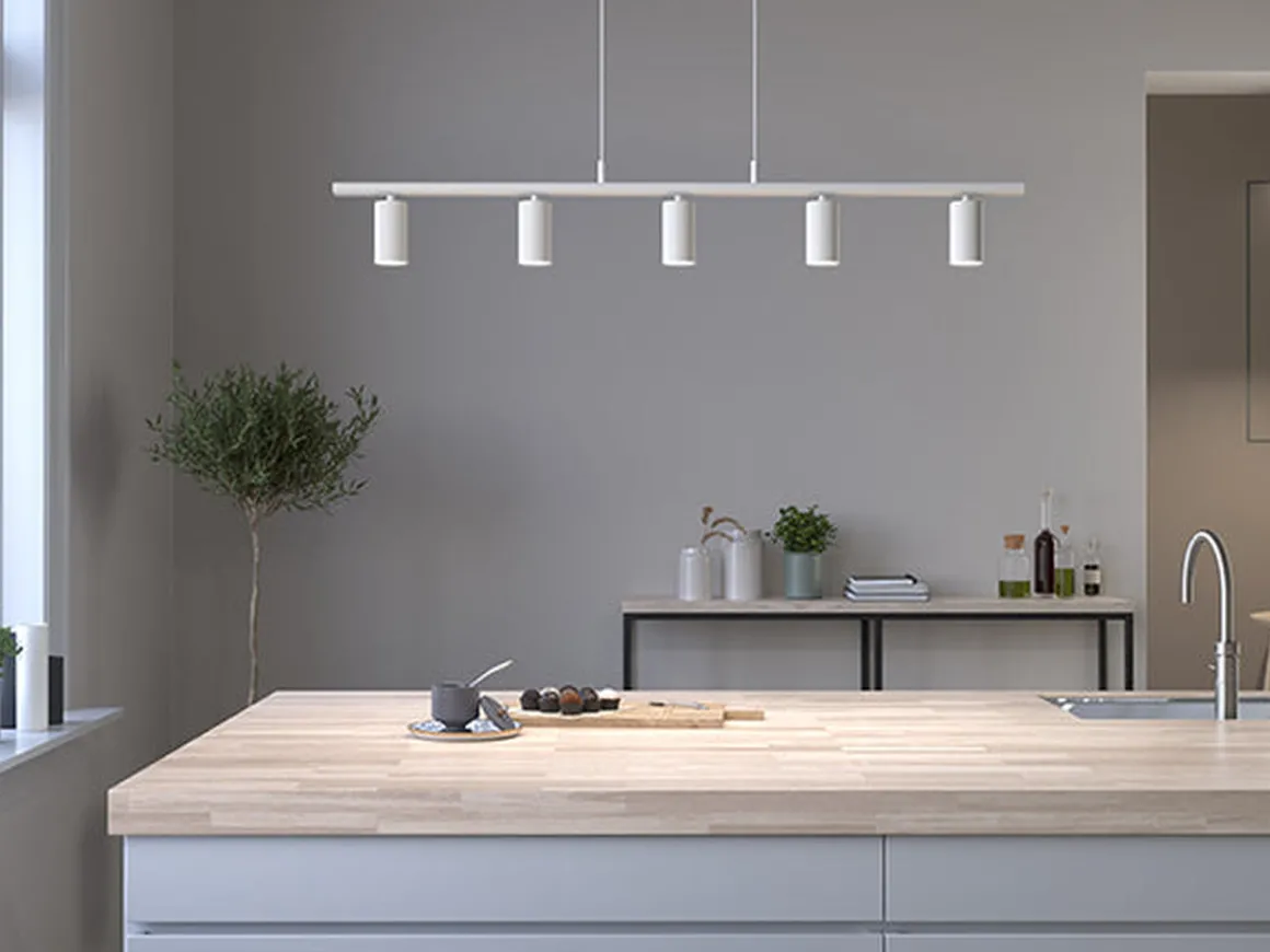 Lucy kommer i matt svart og matt hvitt og passer perfekt over en kjøkkenøy eller over et spisebord.
