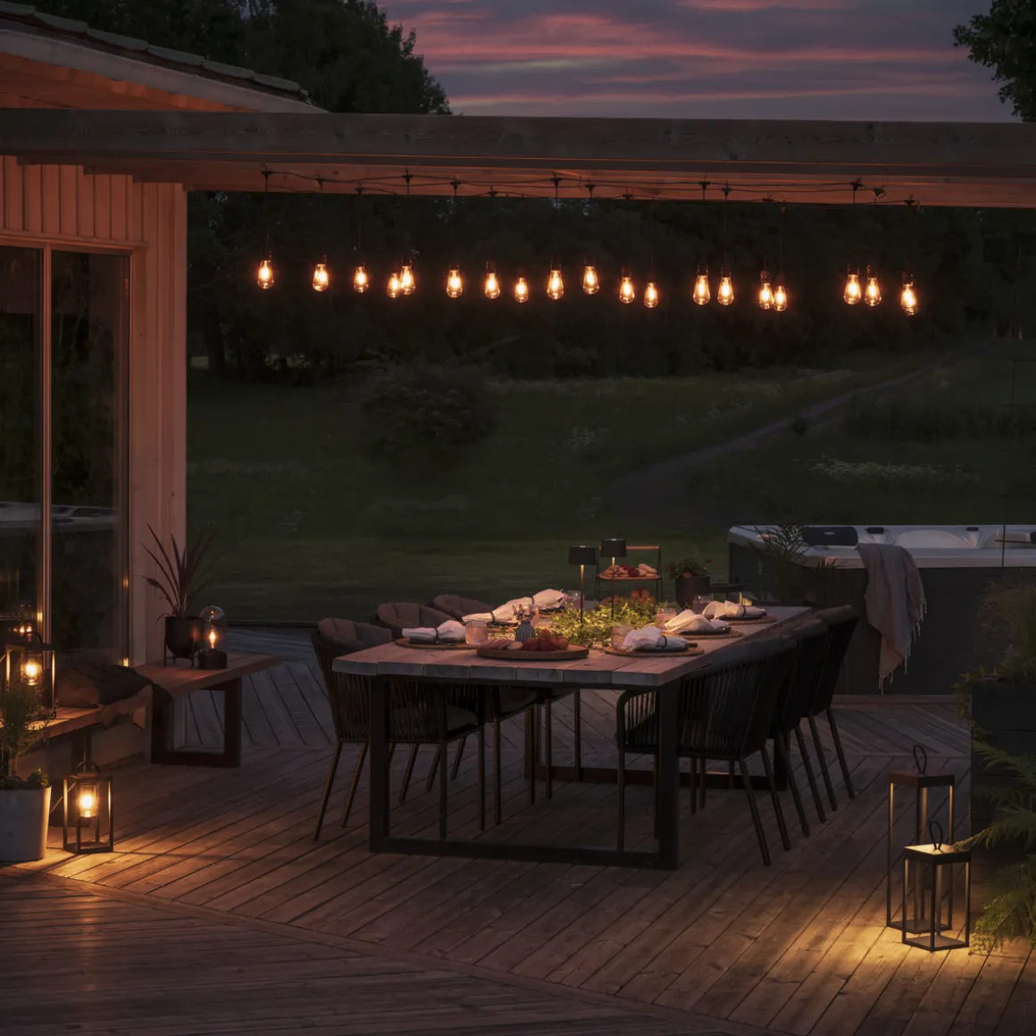 Nydelig lysslynge med amberfarget/varmt lys, som er med på å skape ekstra koselig stemning. Lyspærene henger ned fra hovedledningen og har krok på hvert lyspunkt. Lysslyngen leveres med transformator som har innebygget dimmer, slik at du kan justere lysstyrken etter behov.