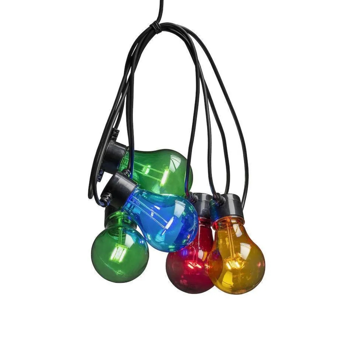 Lysslynge med 10 flerfargede LED-lamper. Faststøpte lyspærer og kuppel i plast som gjør dem uknuselig. Lysene i ulike farger er med på å skape ekstra leken, men koselig stemning.