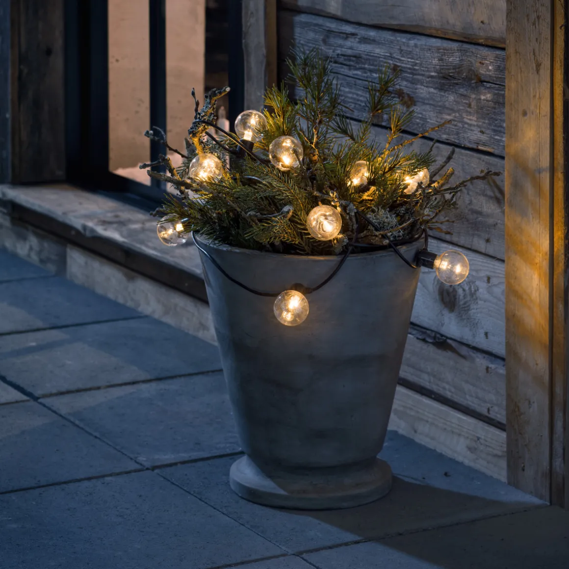 Lysslynge med 20 amber LED-lamper. Faststøpte lyspærer og kuppel i plast som gjør dem uknuselig. Det amberfargede lyset er med på å skape ekstra koselig stemning. Amber er en enda varmere lysfarge enn varmhvit, uten at den blir gul.