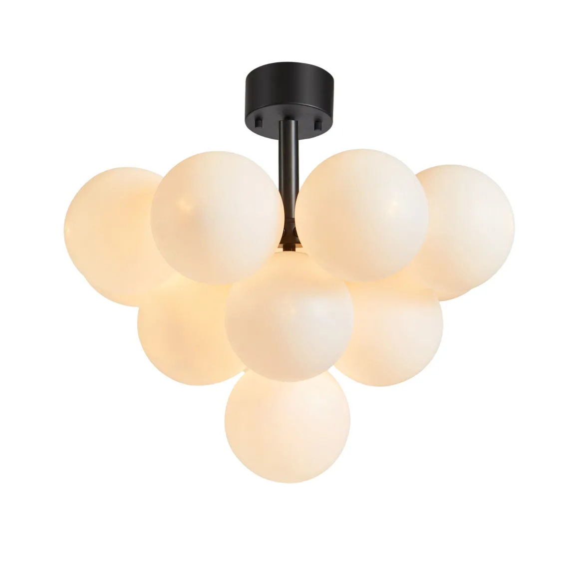 Merlot er en nydelig og dekorativ taklampe med glasskupler i opalhvitt glass. De opalhvite glasskuplene gir et jevnt og behagelig lys. Du behøver 13 stk lyspærer med G9-sokkel til lampen.