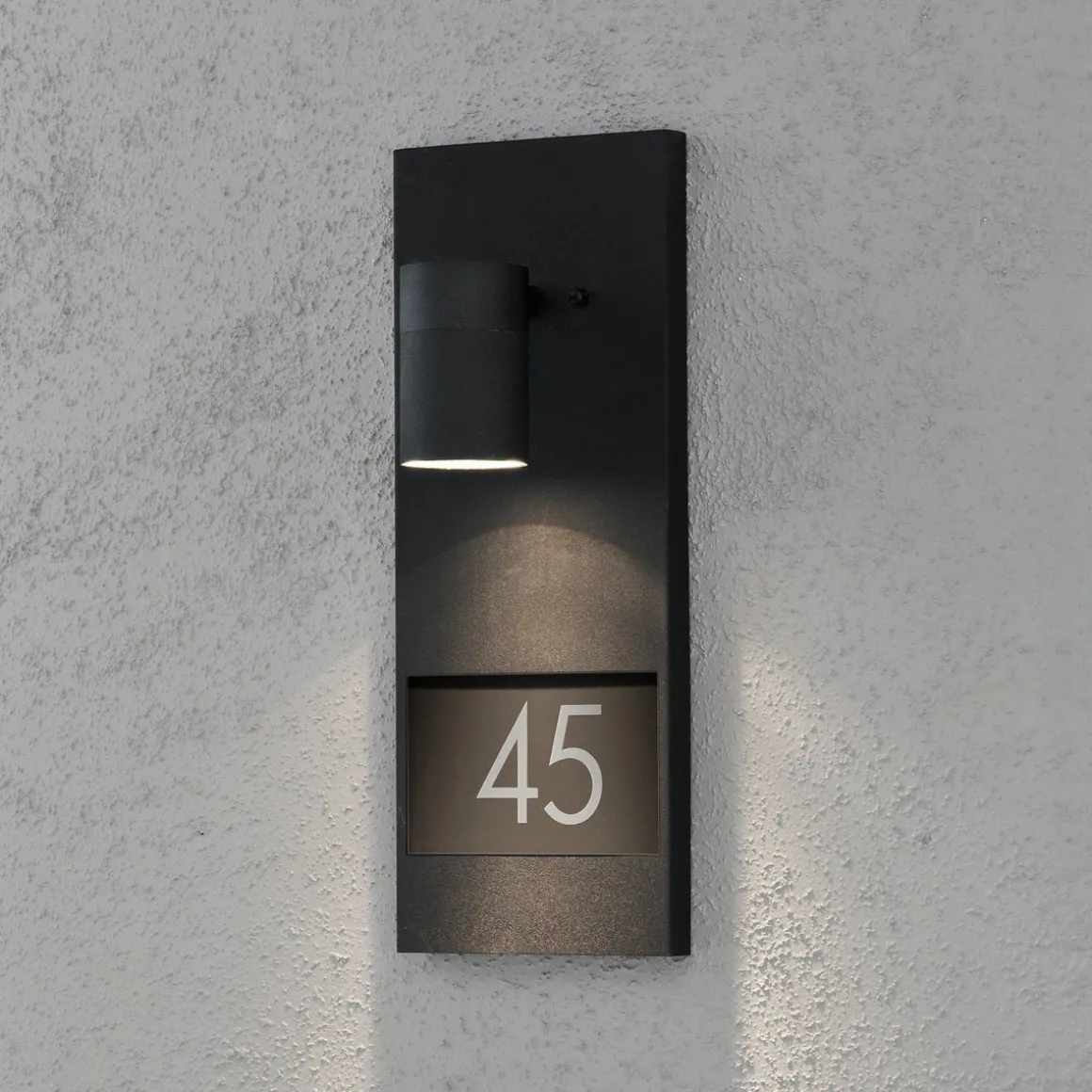 Moderne svart vegglampe med husnummer. Dørskilt med lampe som er en del av en lampeserie.
