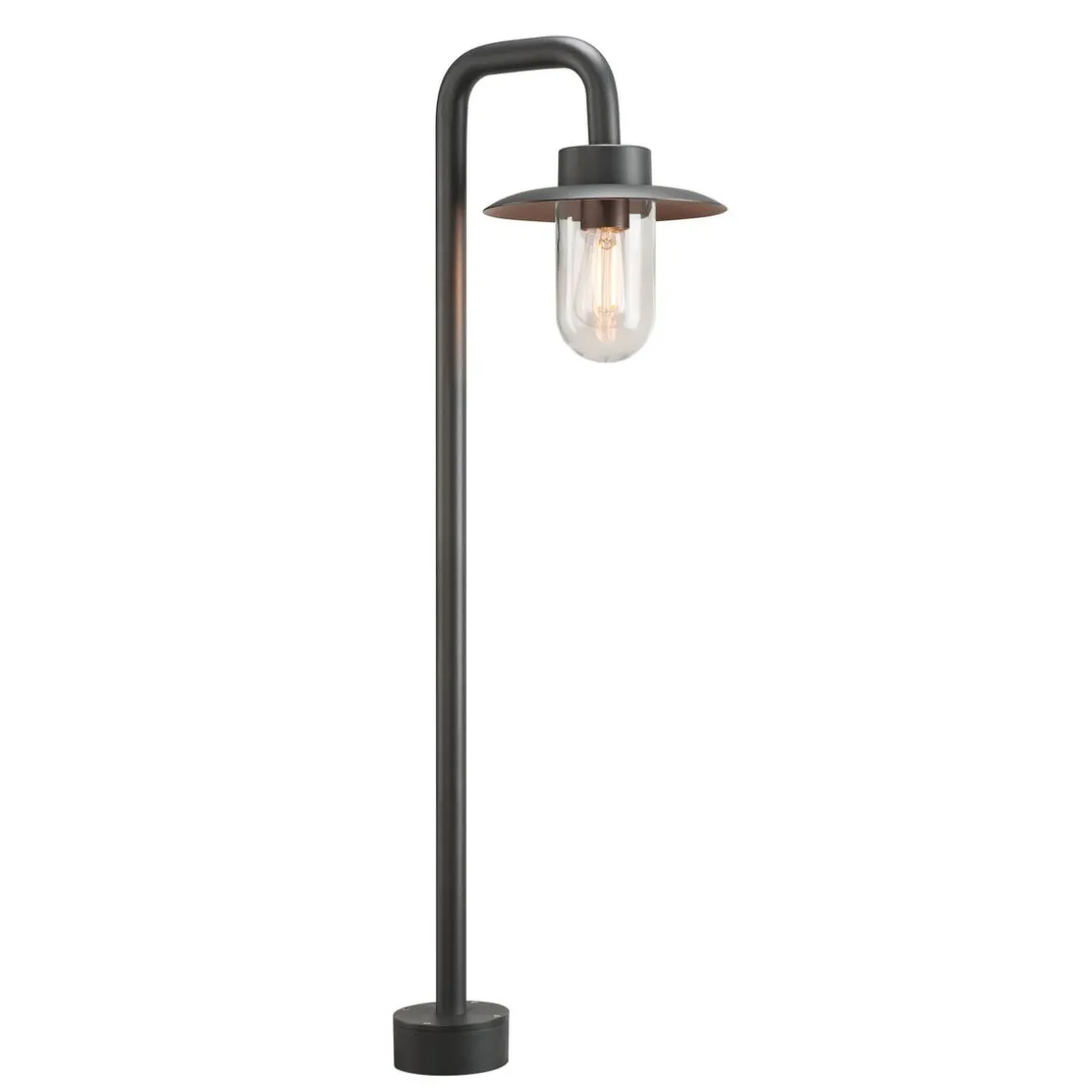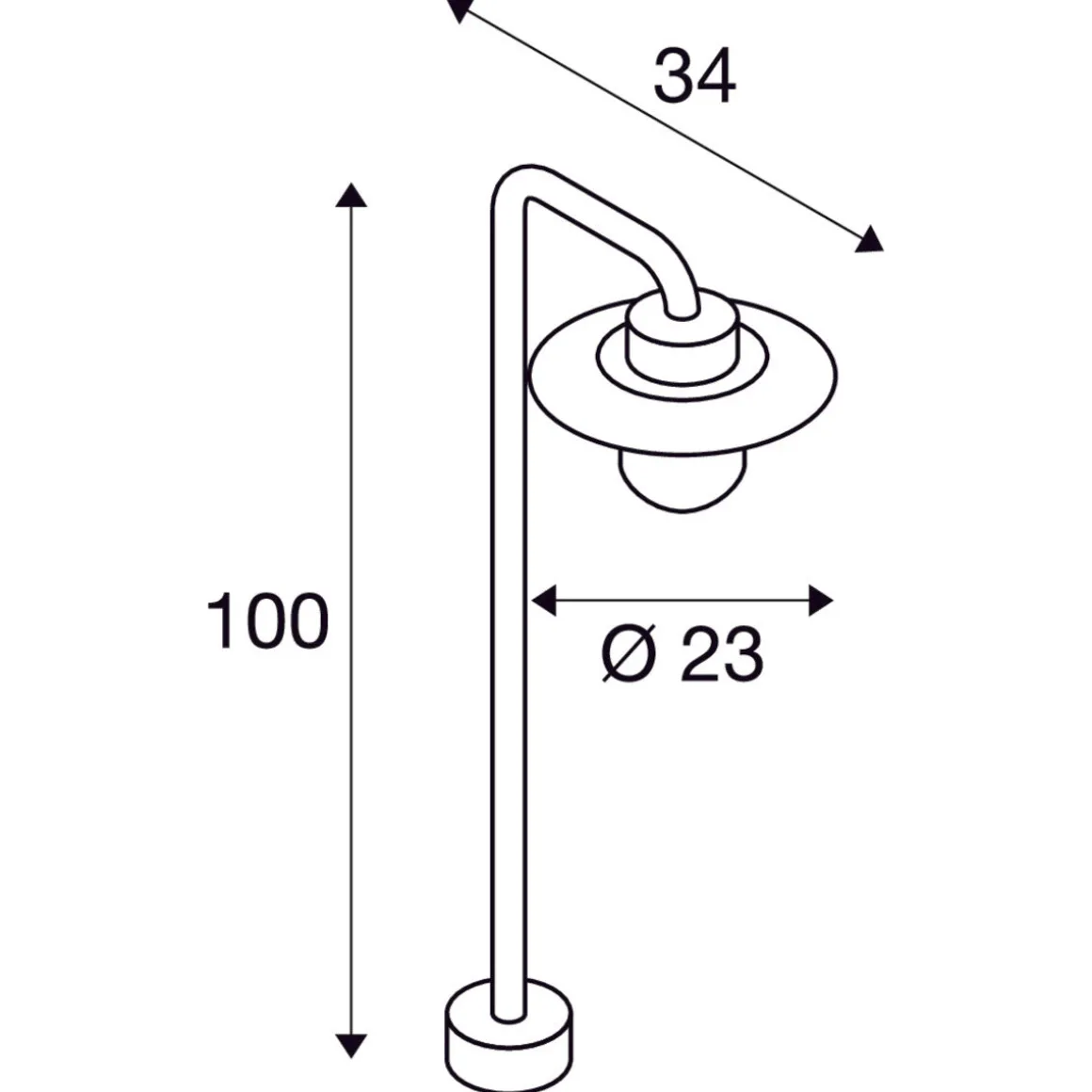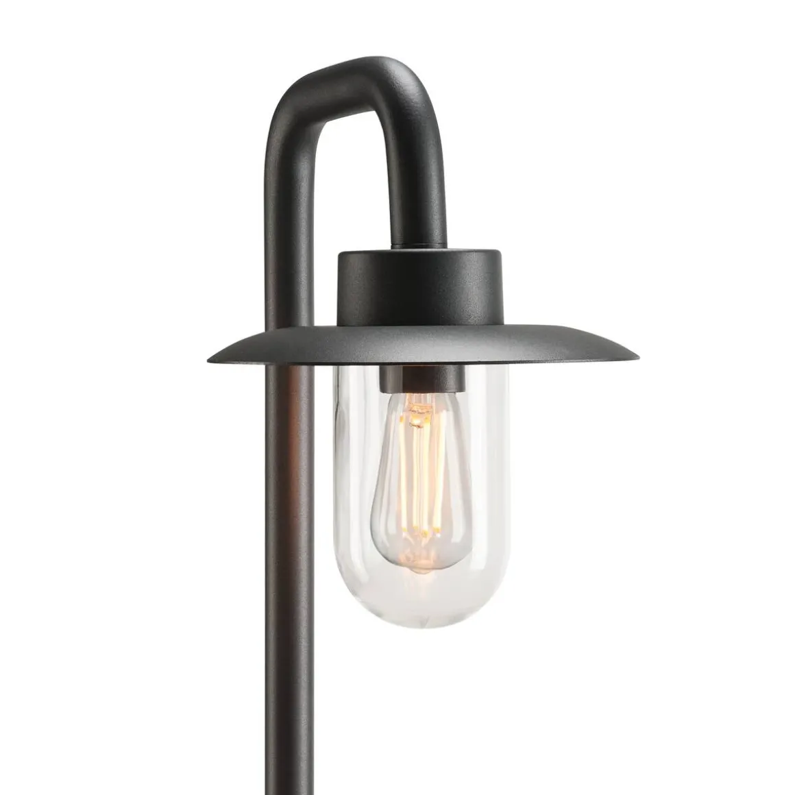 MOLAT POLE pullert er utstyrt med en E27-sokkel og består av aluminium og et armaturglass som skjuler den integrerte sokkelen. armaturhodet er montert på en Fast, buet arm og peker nedover. Med kapslingsgrad IP44 er den egnet til utendørs bruk.