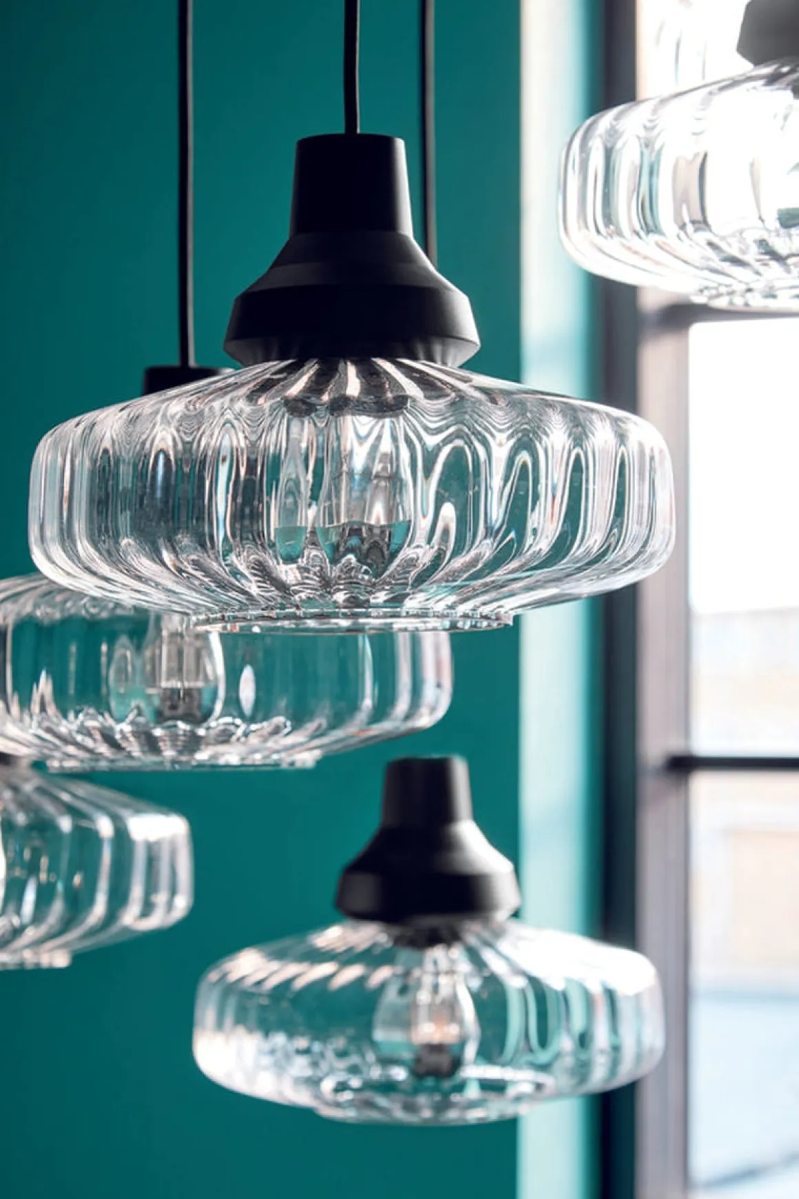 New Optic Wave takpendel er ett godt eksempel på hvordan en lampe kan skape ett helt rom, lampen sprer et fantastisk og levende lys på grunn av formen på det bølgete glasset. Alle lampene i New Wave serien er laget av munnblåste bølgete glass med med en håndmalt kant i sølv.